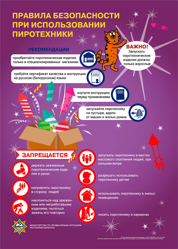 В столице стартовала республиканская акция МЧС "Безопасный Новый год!". Вскоре вся страна погрузится в увлекательный новогодний марафон, а чтобы новогоднее настроение не было омрачено пожарами и другими чрезвычайными случаями, работники МЧС напоминают и рассказывают о правилах безопасности в акции "Безопасный Новый год!", которая проходит с целью предупреждения пожаров и несчастных случаев в результате использования пиротехнических изделий со 2 по 31 декабря 2019 года. Скоро будем устанавливать в квартирах ёлки, а 31 декабря и 1 января многие выйдут на улицу, чтобы фейерверками отметить встречу Нового года. Необходимо помнить о правилах безопасности при подготовке и празднованию новогодних и рождественских праздников. Место ёлки - не возле двери. Устанавливайте ёлку в комнате - уберите ковры. Используйте для ёлки только устойчивые подставки. Ветки и верхушки не должны касаться стен, потолка, мебели. Нельзя устанавливать ёлку вблизи отопительных приборов, в проходах и возле дверей. Откажитесь от ракет с дефектами. Петарды, ракеты, фейерверки покупайте только в специализированных магазинах, где имеется сертификат соответствия правилам безопасности. Инструкция должна быть на русском или белорусском языках. Действуйте в соответствии с нею. Обратите внимание на срок годности изделия и на целостность заводской упаковки. Откажитесь от покупки пиротехнических изделий с дефектами: мятых, влажных, с повреждениями корпуса и фитиля.