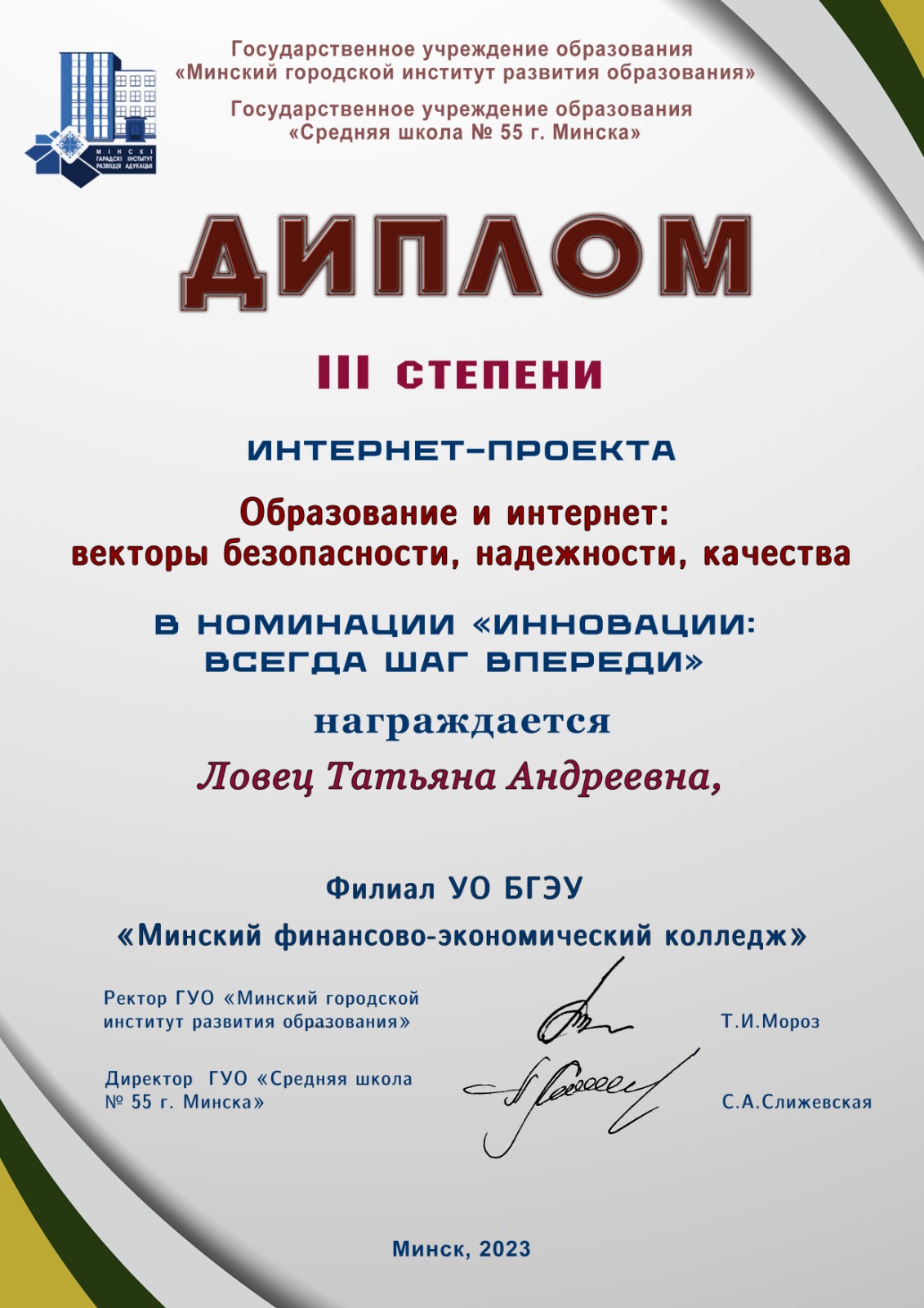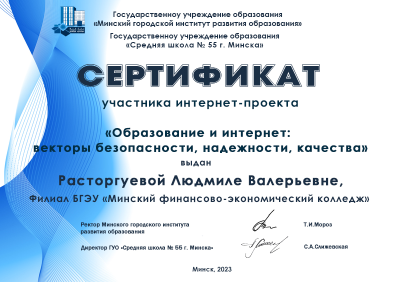 С 04 января 2023 года по 28 апреля 2023 года на Минской городской платформе дистанционного обучения проводился интернет-проект «Образование и интернет: векторы безопасности, надежности, качества», организаторами которого выступили: государственное учреждение образования «Минский городской институт развития образования»; управление по образованию администрации Ленинского района г. Минска и государственное учреждение образования «Средняя школа № 55 г. Минска» – ресурсный центр информационных технологий Ленинского района г. Минска.