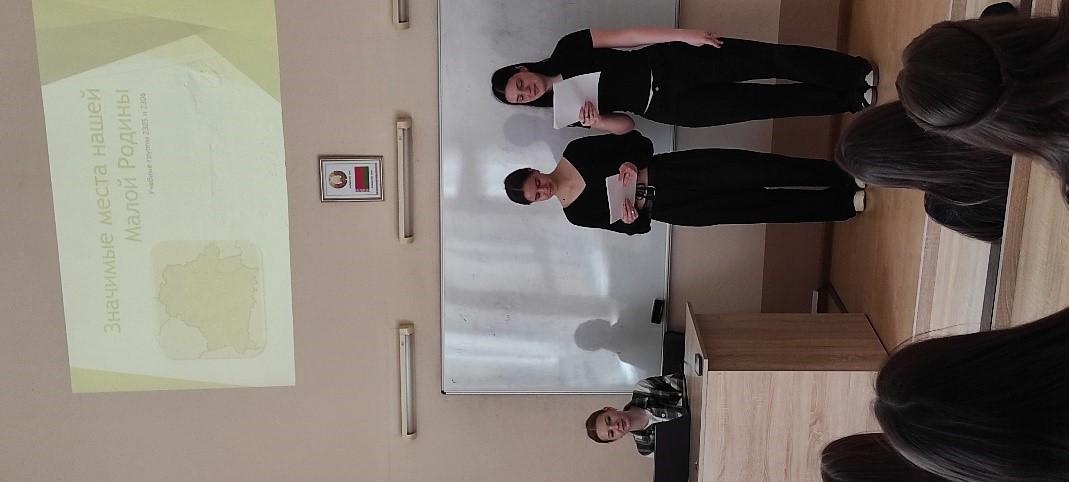 Учащиеся групп, проживающие до поступления в колледж в разных уголках нашей республики, познакомили друг друга с историей своих населенных пунктов, с памятными местами и выяснили для себя, какое значение в их жизни имеет Родина. Так же учащиеся подготовили содержательную информацию о самых знаковых для белорусов достопримечательностях: Мирском и Несвижском замках, Национальном Полоцком историко-культурном музе-заповеднике, Музее Марка Шагала в Витебске, Брестской крепости и Беловежской пущей.
