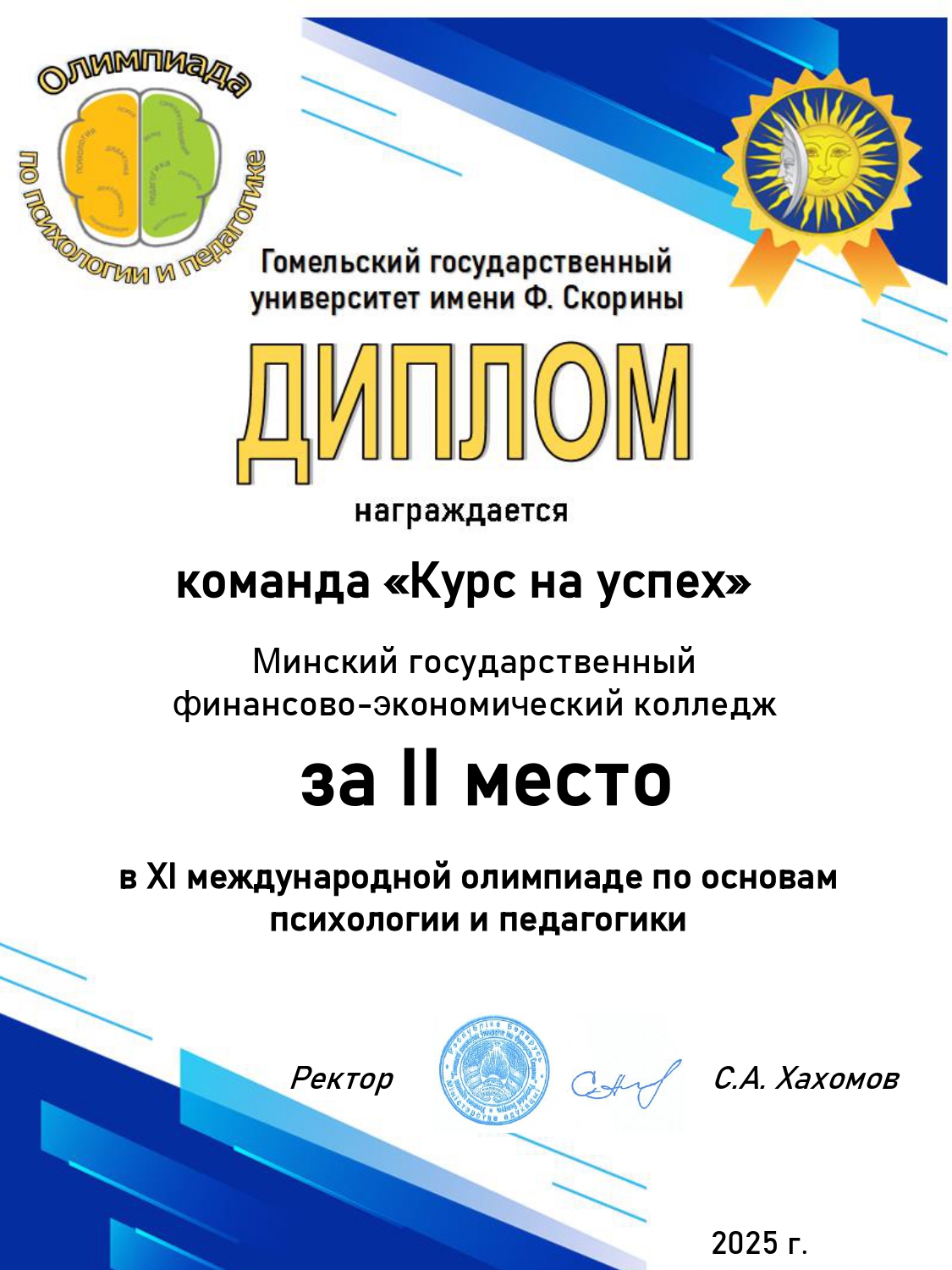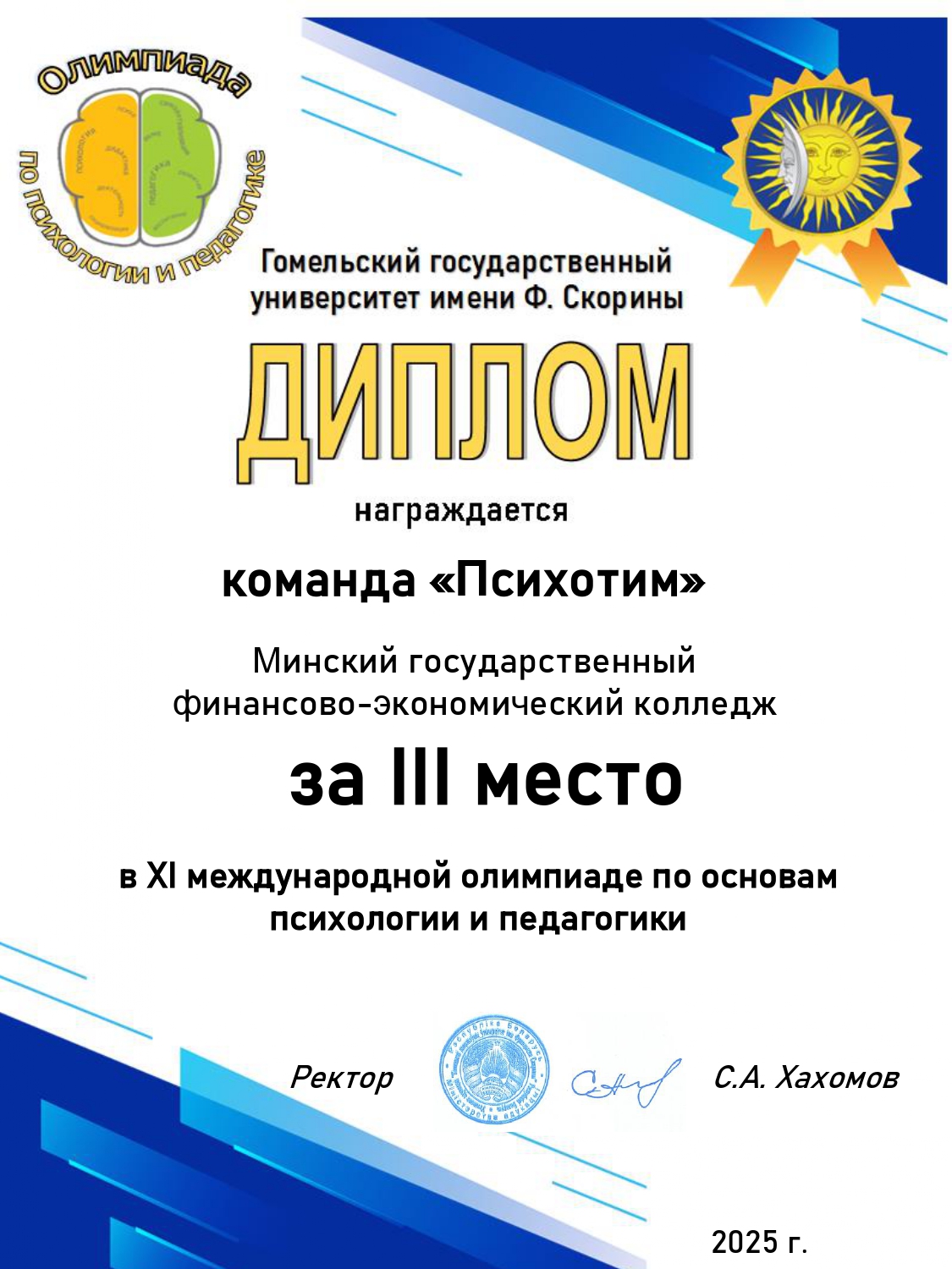 4 июня 2025 года было организовано награждение участников XI международной олимпиады по основам психологии и педагогики «Личность против насилия», которую проводил Гомельский государственный университет им. Ф. Скарины. Олимпиада проходила в 3 этапа с 24 марта по 30 апреля 2025 года. Учащиеся колледжа под руководством педагога-психолога О.А. Игнатени приняли в ней участие. Четыре команды от колледжа прошли регистрацию: «Эмпаты» (группа 2304); «Курс на успех» (группа 2406); «ПсихоТворцы» (группа 2405); «Психотим» (группа 2303). Олимпиада проходила в онлайн формате.