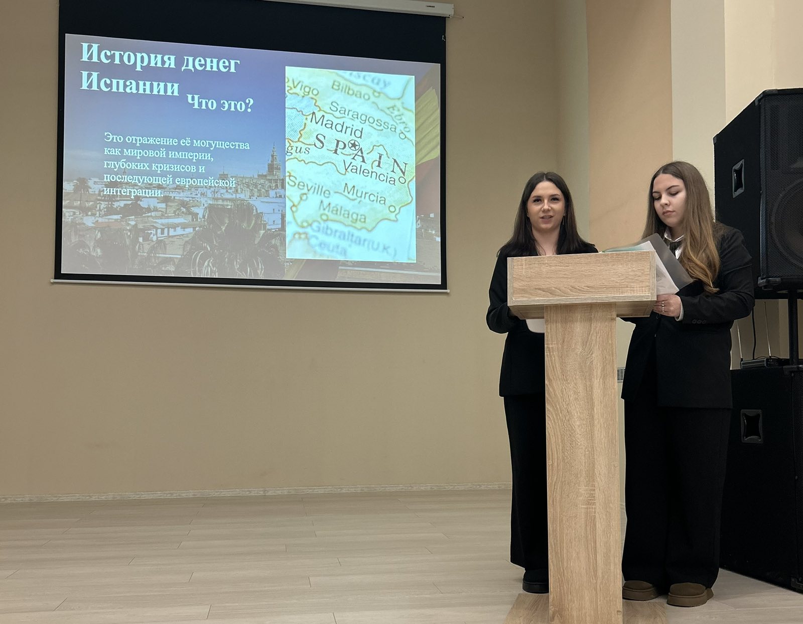 1 место заняли учащиеся группы 2507 Лысенко Юлия, Петровская Ариана с докладом о денежной системе Испании;
