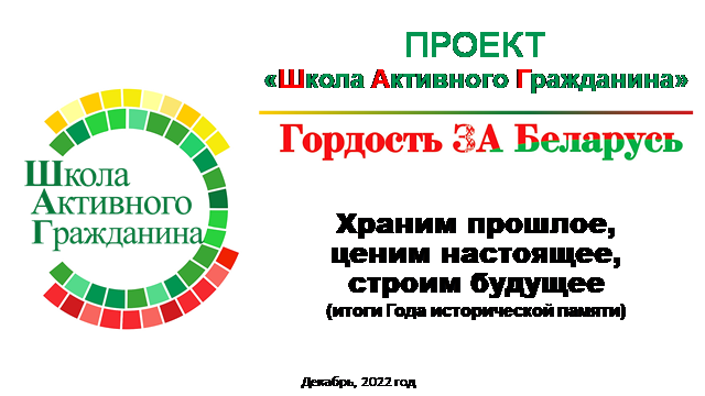 22 декабря 2022 года в учебных группах 1 и 2 курсов, а также в общежитии филиала прошли мероприятия в рамках проекта «Школа Активного Гражданина» на тему Гордость за Беларусь. Храним прошлое, ценим настоящее, строим будущее» (итоги Года исторической памяти).