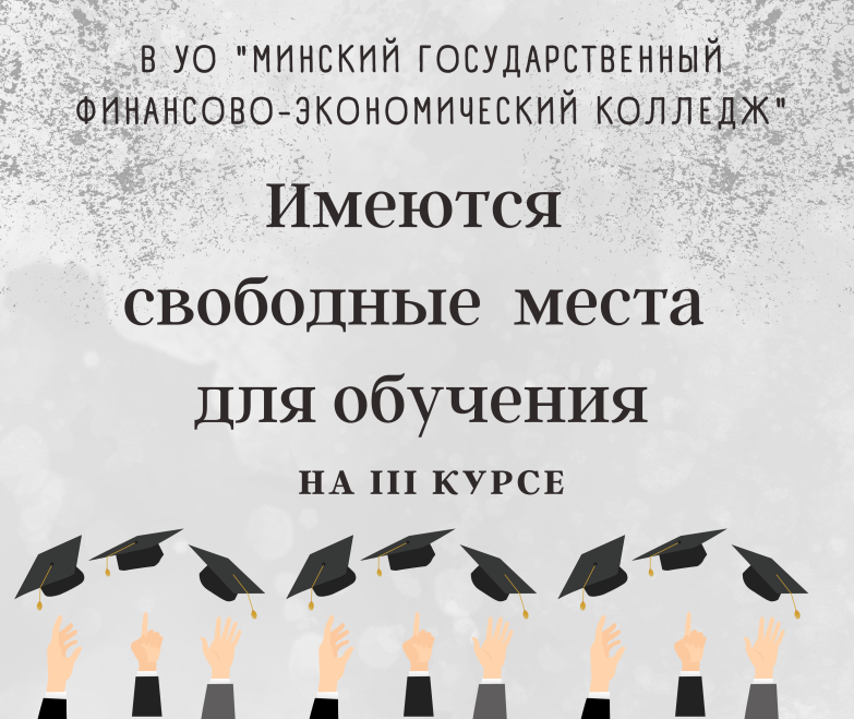 В УО «Минский государственный финансово-экономический колледж» в связи с движением учащихся имеются свободные места на III курсе для обучения на платной основе. Подробная информация представлена в таблице. Лицам, заинтересованным в переводе или восстановлении в колледж, обращаться по тел. 324 20 96 (Сухоцкая Вероника Михайловна, заместитель директора по учебной работе), тел. 272 20 78 (Пархимчик Ольга Николаевна, Ловец Татьяна Андреевна, заведующие отделениями).