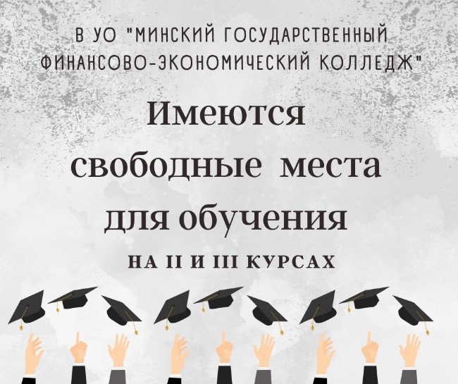 В УО «Минский государственный финансово-экономический колледж» в связи с движением учащихся имеются свободные места на II и III курсах для обучения на платной основе. Подробная информация представлена в таблице. Лицам, заинтересованным в переводе или восстановлении в колледж, обращаться по тел. 324 20 96 (Сухоцкая Вероника Михайловна, заместитель директора по учебной работе), тел. 272 20 78 (Пархимчик Ольга Николаевна, Ловец Татьяна Андреевна, заведующие отделениями).