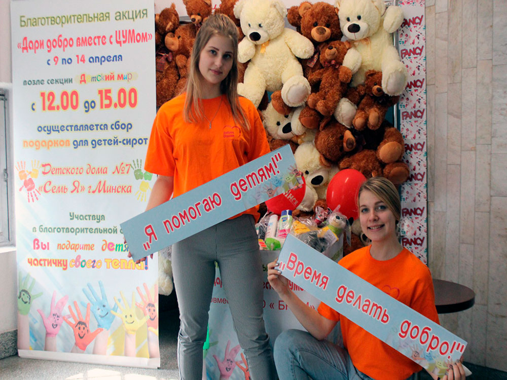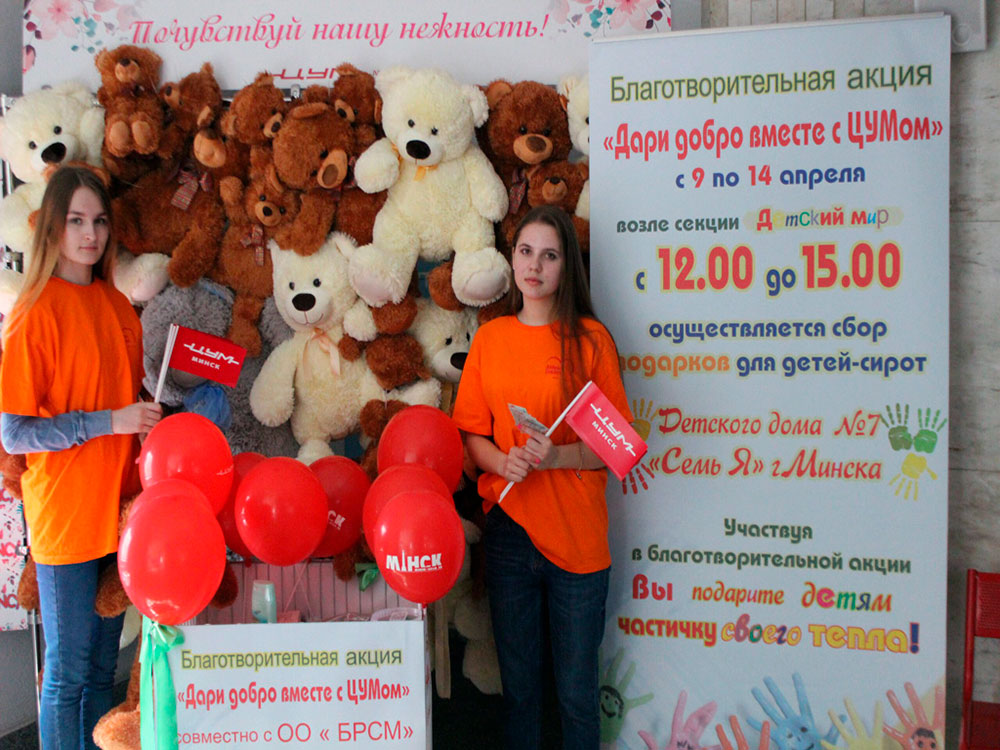 С 9 по 14 апреля 2018 года на базе ОАО «ЦУМ Минск» совместно с Советским районной организацией ОО «БРСМ» г.Минска прошла благотворительная акция «Дари добро детям вместе с ЦУМом!». В рамках акции активисты ОО «БРСМ» филиала на протяжении недели возле секции «Детский мир» осуществляли сбор подарков для детей-сирот ГУО детский дом №7 «Семь Я» г.Минска. В скором времени все собранные подарки будут переданы воспитанникам детского дома.