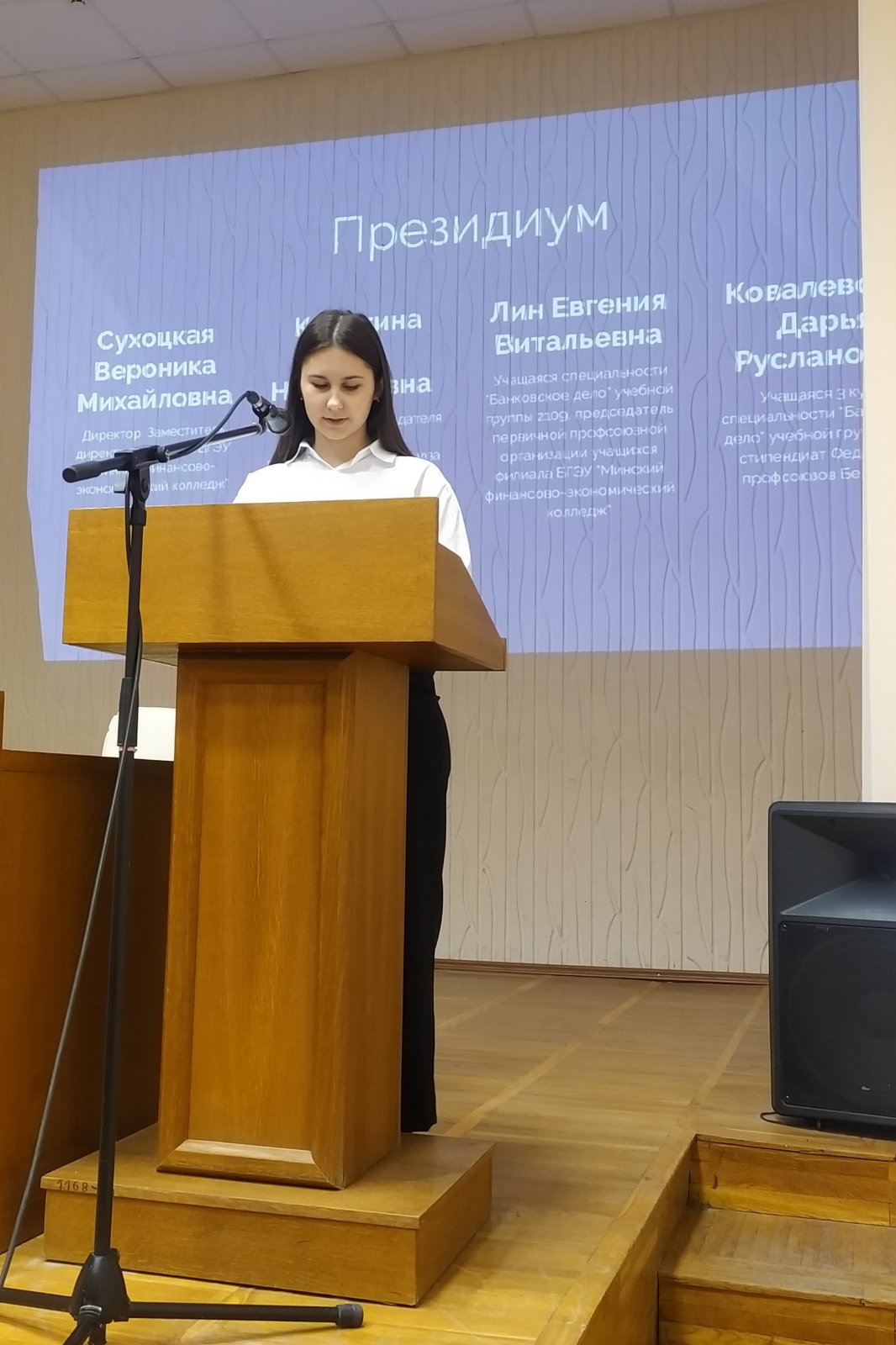 Лин Евгения Витальевна, учащаяся специальности «Банковское дело» учебной группы 2109, председатель первичной профсоюзной организации учащихся филиала БГЭУ «Минский финансово-экономический колледж»;