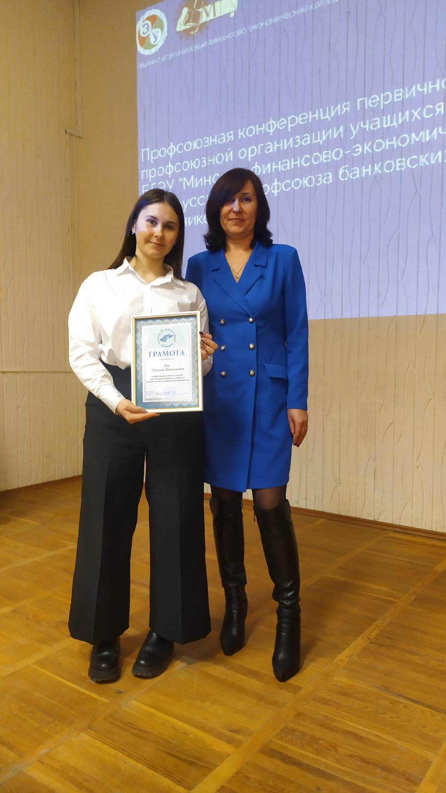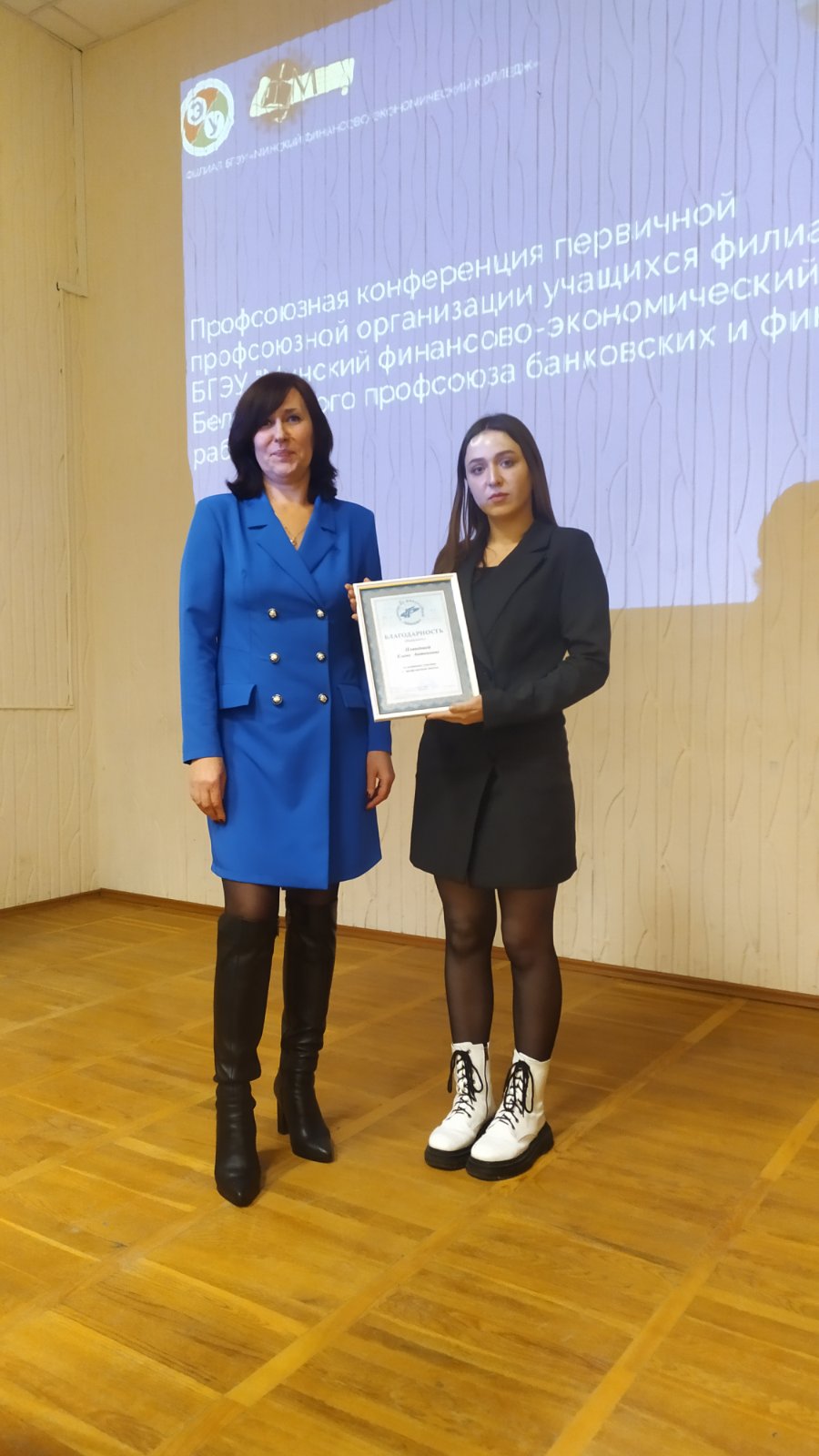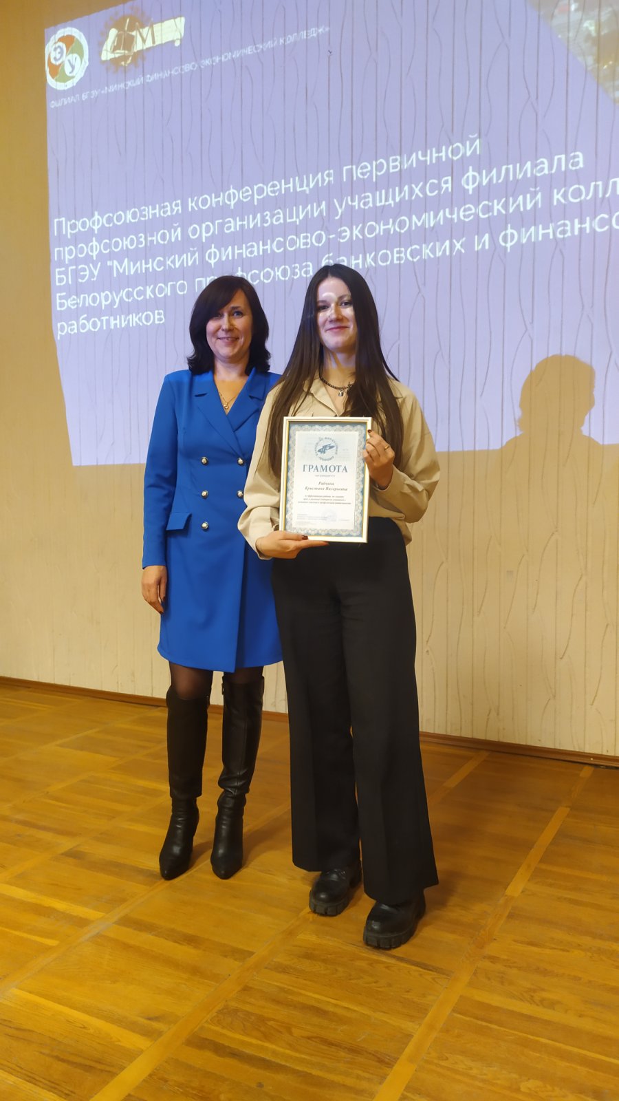 Работа конференции завершилась торжественным вручением грамот и благодарностей профсоюзному активу филиала. Грамотами Республиканского комитета Белорусского профсоюза банковских и финансовых работников были награждены учащиеся филиала: