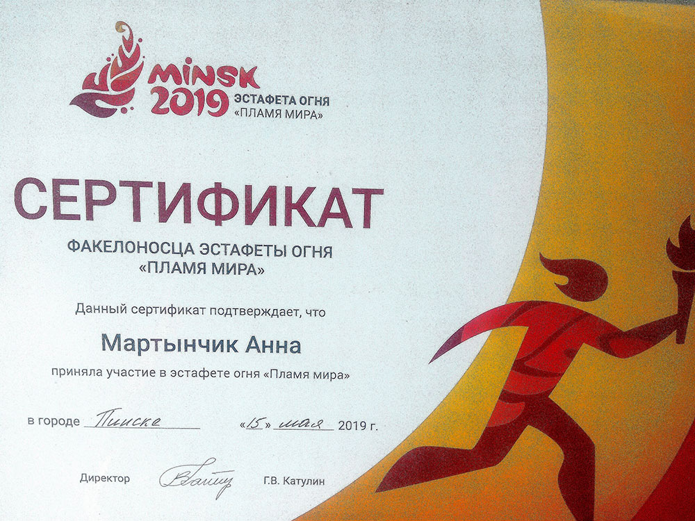Выпускница колледжа 2013 года специальности «Банковское дело» поэт, лауреат международных поэтических конкурсов, организатор литературных концертов и фестивалей Беларуси и России, автор трех поэтических сборников, Мартынчик Анна вошла в список 450 известных людей Беларуси, которые удостоены чести нести Пламя мира II Европейских игр. Анна приняла участие в этапе эстафеты в Пинске 15 мая. Гордимся нашими выпускниками.