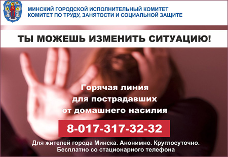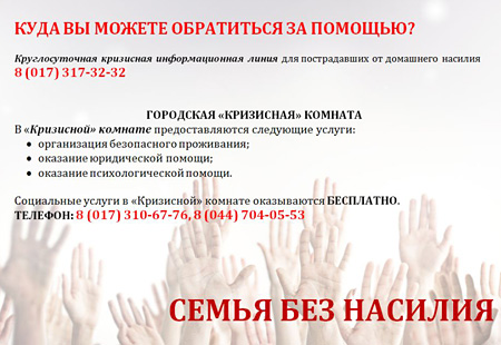 - (8 017) 317 -32-32(круглосуточно) Городской центр психологической помощи семье и детям (ПЦППСД) (ул. Чеботарева, 6А)
