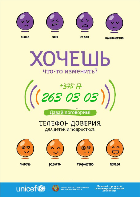- (8 017) 263–03 - 03 – телефон доверия для детей и подростков. Работает круглосуточно