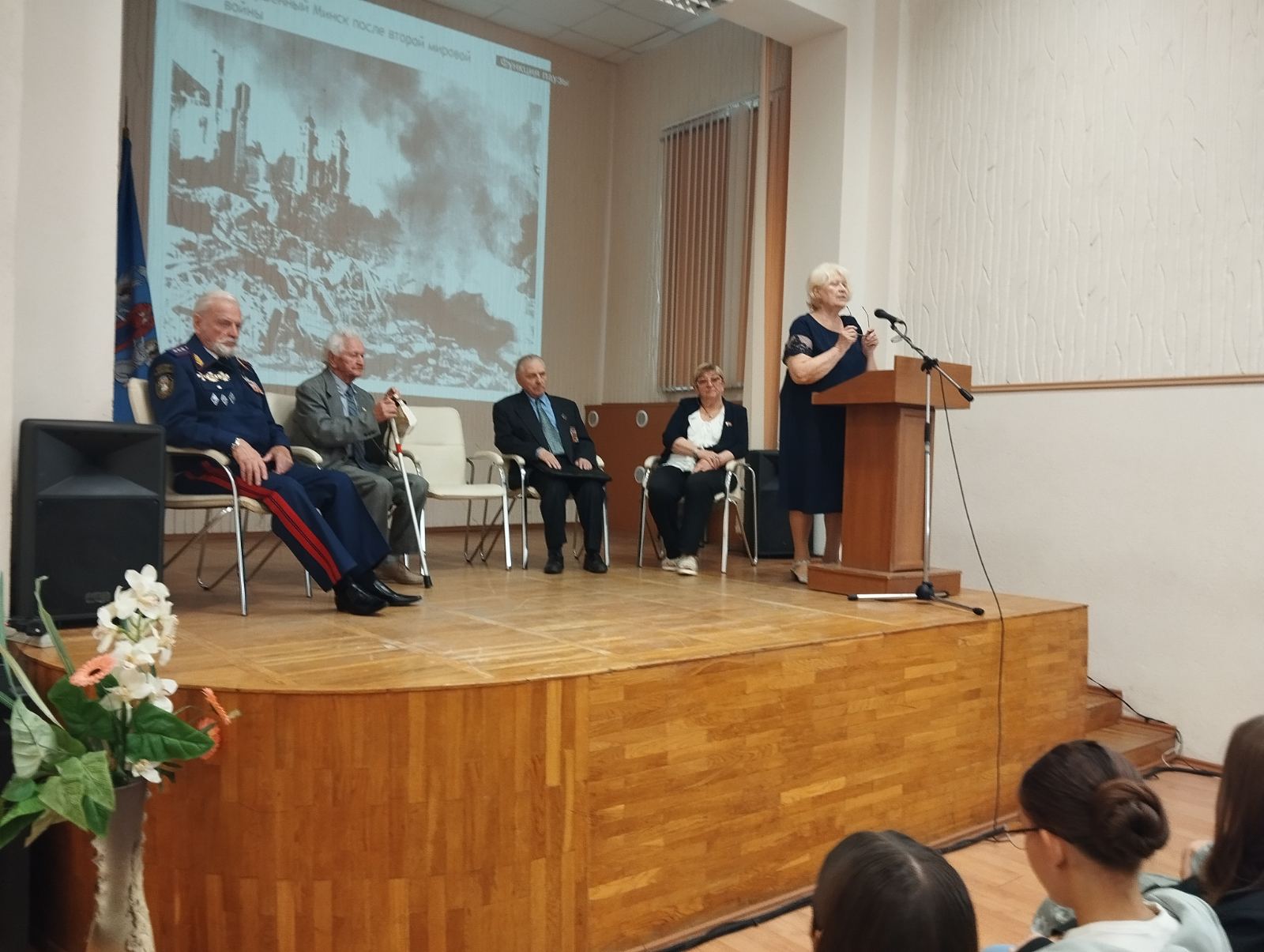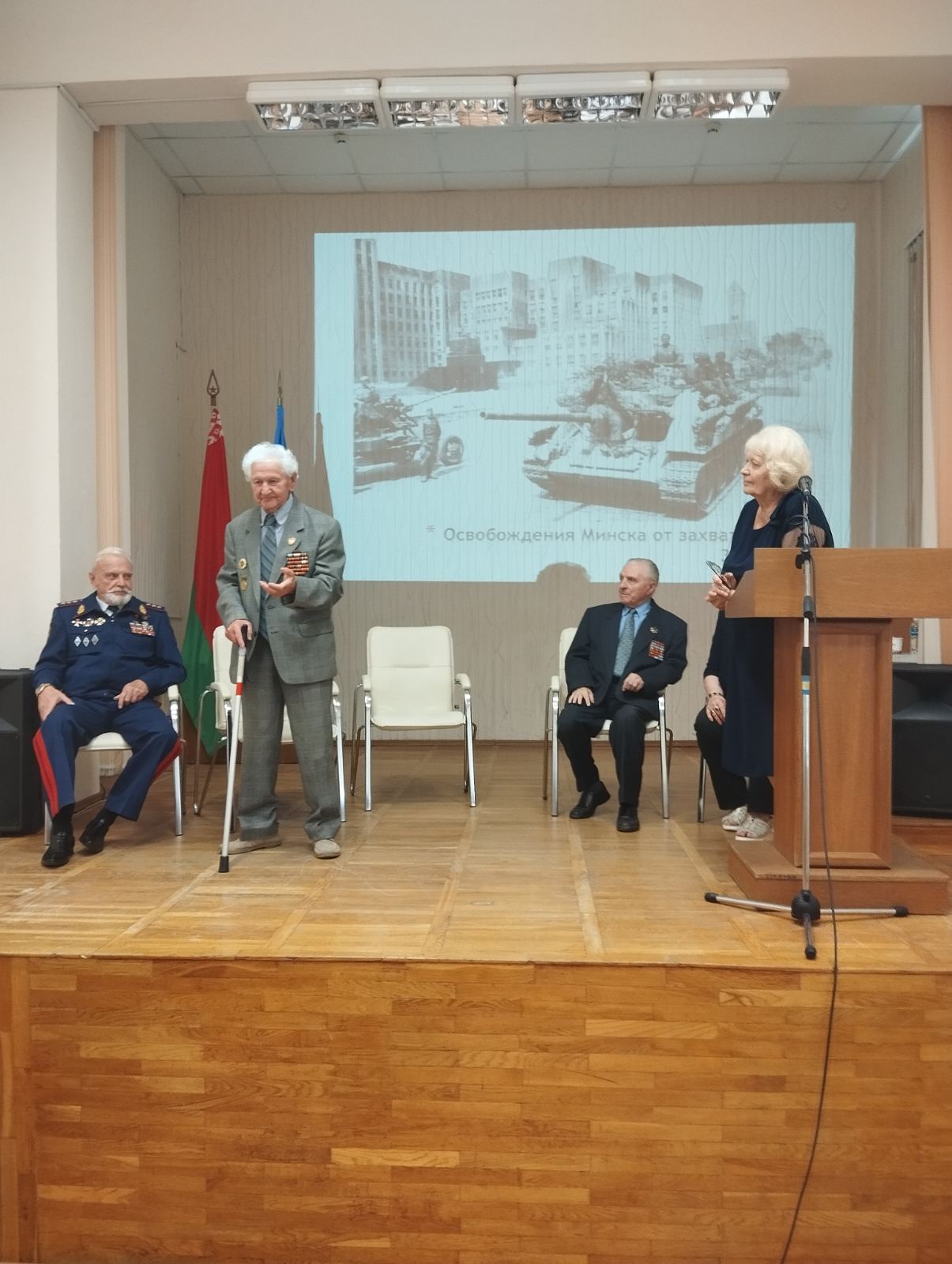 Председатель Совета Советской районной организации ветеранов г. Минска Петрова Валентина Фёдоровна, заместитель председателя Совета Советской районной организации г. Минска Коваленко Ольга Александровна, ветеран Великой Отечественной войны Ерёмин Леонид Александрович, генерал-полковник Россолай Евгений Александрович, Воин-интернационалист, участник боевых действий в Афганистане Тарасевич Аркадий Григорьевич.