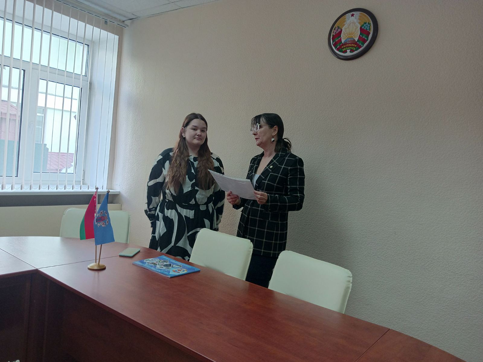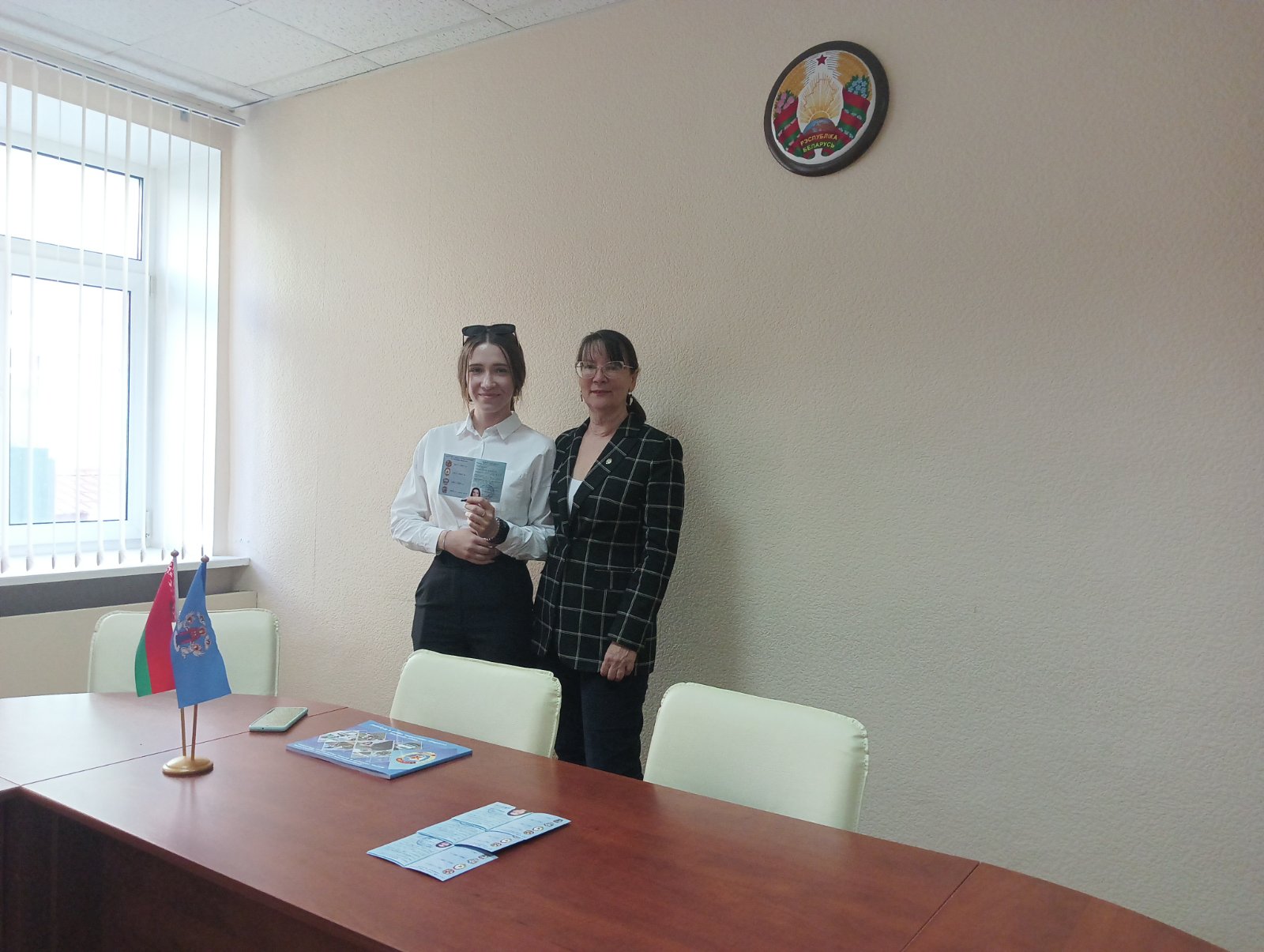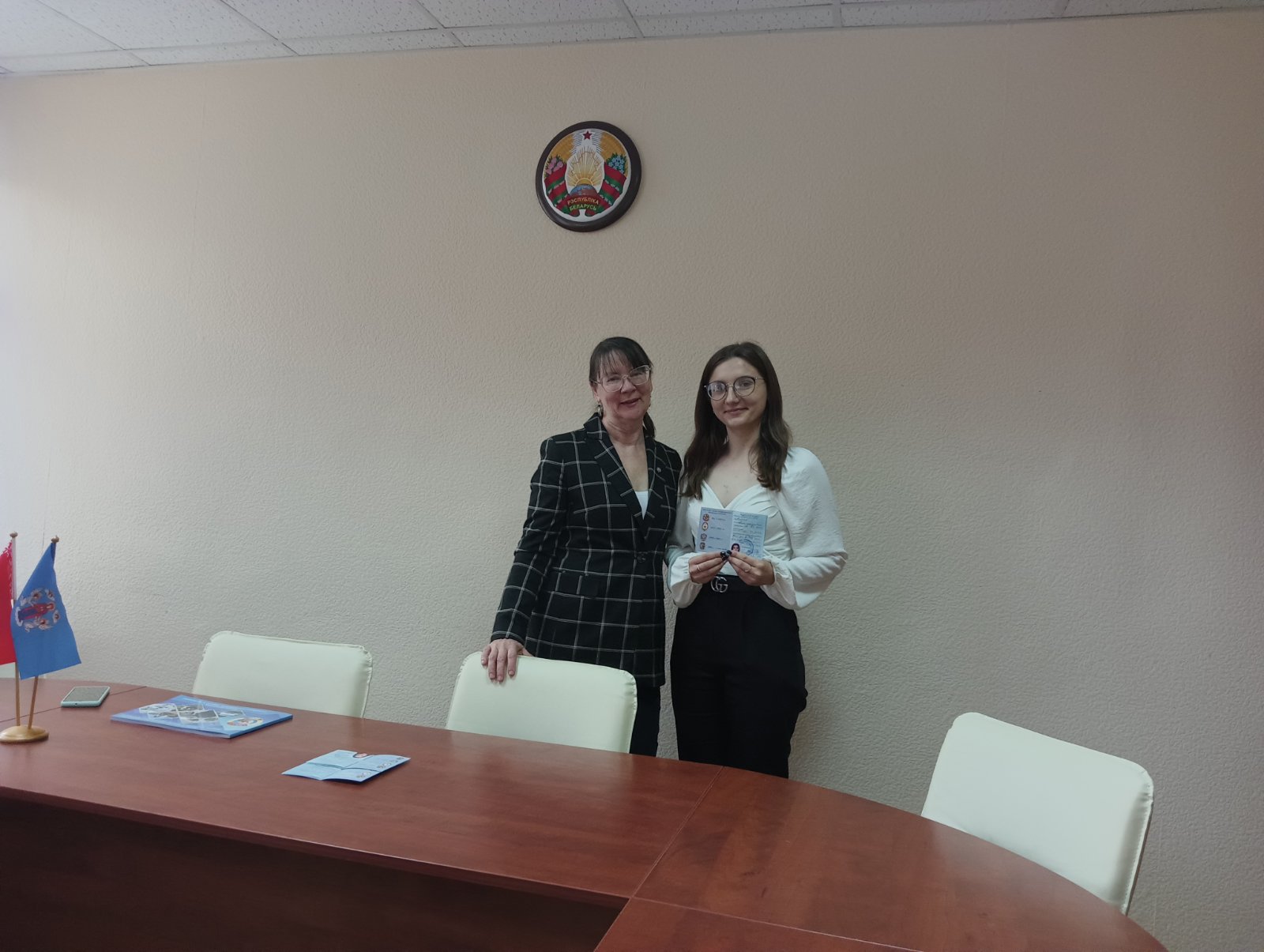 23 мая 2024 года в торжественной обстановке специалист по организационной и идеологической работе Советской РОС ДОСААФ г. Минска Барсукова Светлана Анатольевна вручила учащейся группы 2310 Полянской Надежде подарок и диплом победителя первого отборочного тура среди конкурсантов ПОС РОС ДОСААФ г. Минска Х Республиканского конкурса песни «Любовь к Отечеству храня…», а также членские билеты новым членам ДОСААФ.