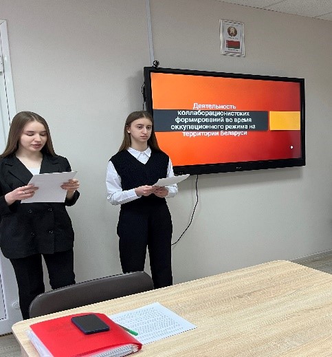 13 января 2025 года в учебной группе 2301, специальность «Бухгалтерский учет, анализ и контроль», состоялся информационный час на тему «Деятельность коллаборационистских формирований» (О геноциде белорусского народа в годы Великой отечественной войны).