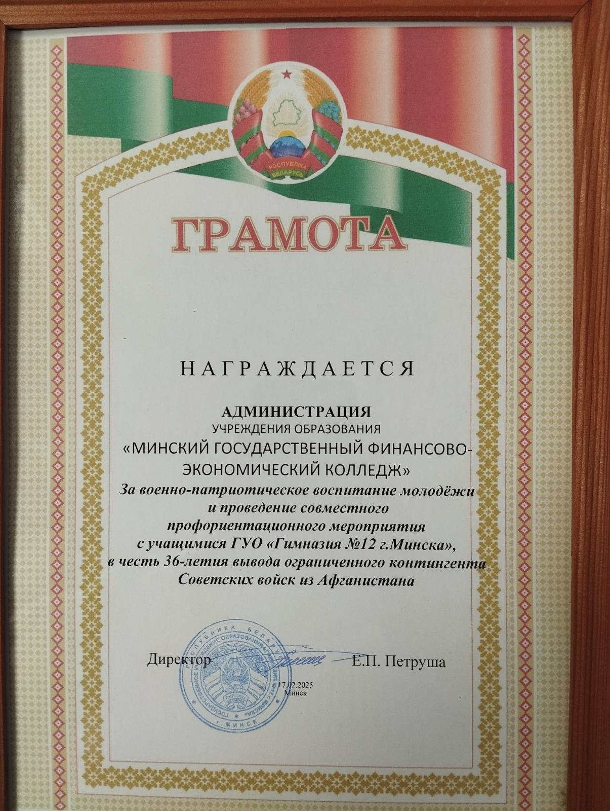 17 февраля 2025 года учащиеся учреждения образования «Минский государственный финансово-экономический колледж» посетили ГУО «Гимназия № 12 г. Минска» и приняли участие в мероприятии, посвящённом 36-летию вывода Советских войск из Афганистана. В завершении мероприятия учащиеся колледжа провели профориентационную беседу с учащимися 9 и 11 классов.