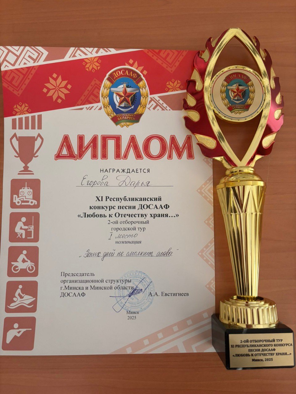 24 февраля 2025 года на базе учреждения образования «Минский государственный дворец детей и молодёжи» состоялся второй отборочный (г. Минска) тур XI Республиканского конкурса песни ДОСААФ «Любовь к Отечеству храня…». Учащаяся колледжа Егорова Дарья заняла первое место в номинации «Этих дней не смолкнет слава». Победительница награждена дипломом и кубком ДОСААФ и представит город Минск в 3-ем финальном туре Республиканского конкурса.
