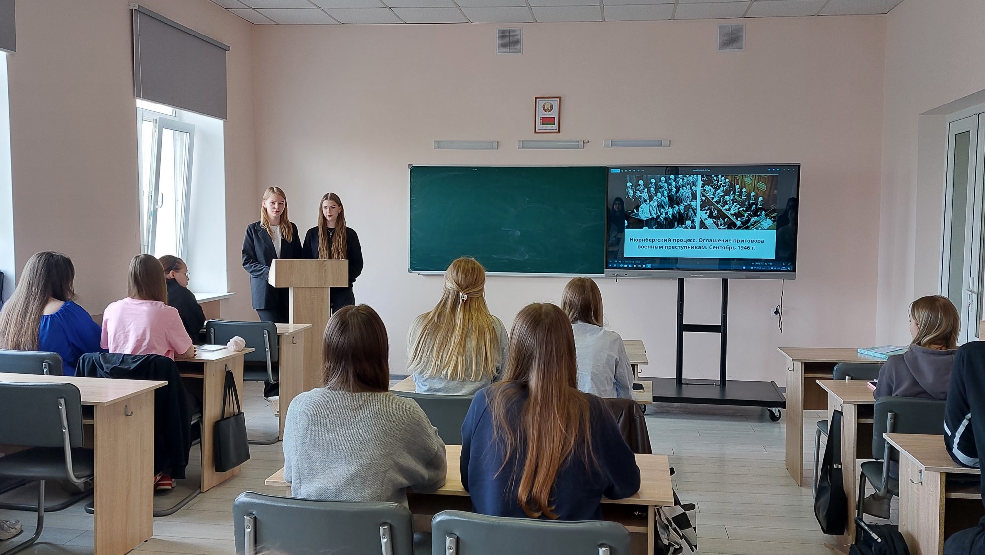 25 апреля 2025 года в учебной группе 2407 (куратор Войнич Т.А.) проведен информационный час, посвященный геноциду белорусского народа в годы Великой отечественной войны на тему «Судебные процессы в отношении нацистских преступников и их пособников».