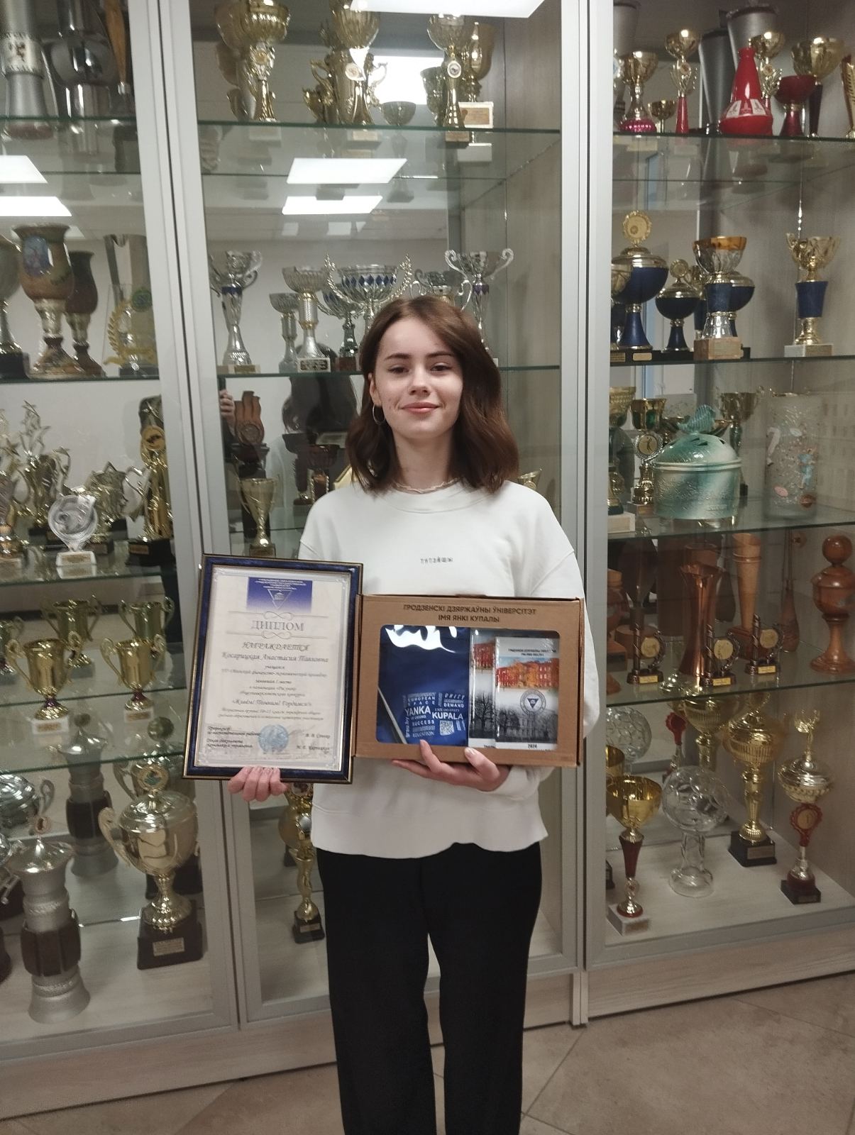 23 мая 2024 года директор учреждения образования «Минский государственный финансово-экономический колледж» Оксана Анатольевна Бесько вручила подарок и диплом учащейся группы 2306 Косарицкой Анастасии, занявшей первое место в номинации «Рисунок» общеуниверситетского конкурса «Живем! Помним! Гордимся!», также пожелала Анастасии силы воли и духа, терпения и дальнейших творческих успехов.
