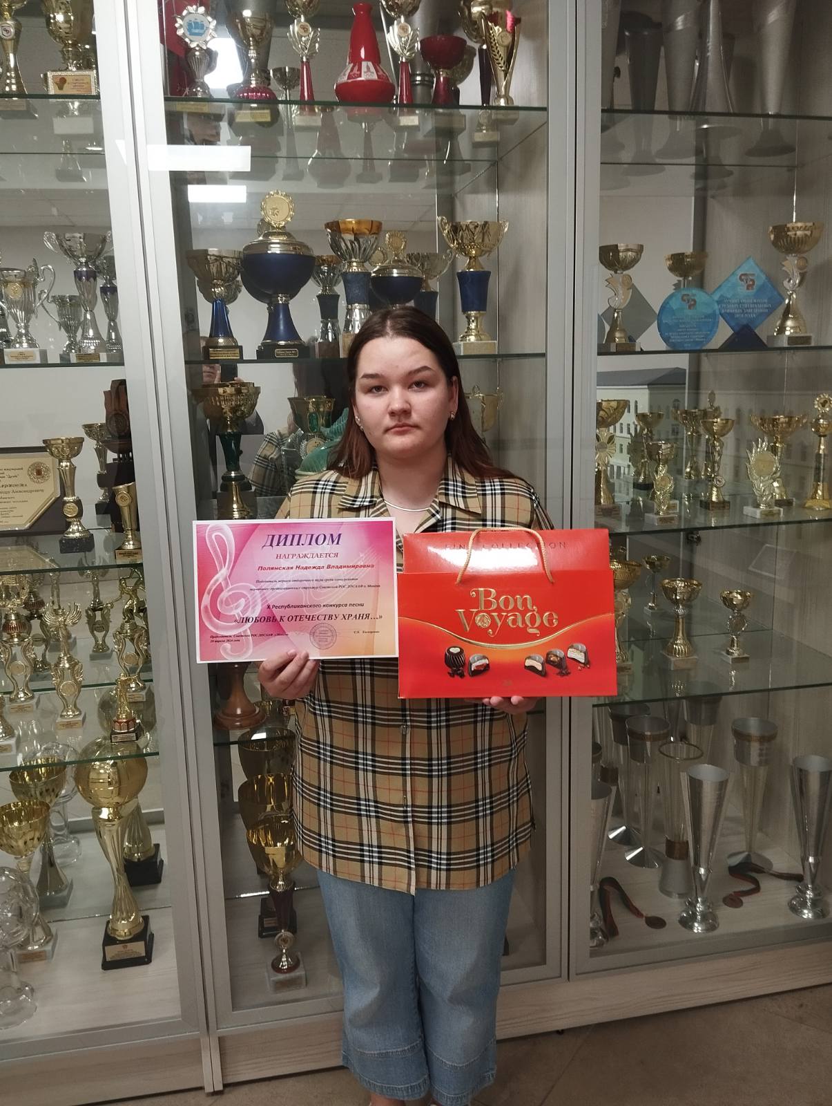 23 мая 2024 года в торжественной обстановке специалист по организационной и идеологической работе Советской РОС ДОСААФ г. Минска Барсукова Светлана Анатольевна вручила учащейся группы 2310 Полянской Надежде подарок и диплом победителя первого отборочного тура среди конкурсантов ПОС РОС ДОСААФ г. Минска Х Республиканского конкурса песни «Любовь к Отечеству храня…», а также членские билеты новым членам ДОСААФ.