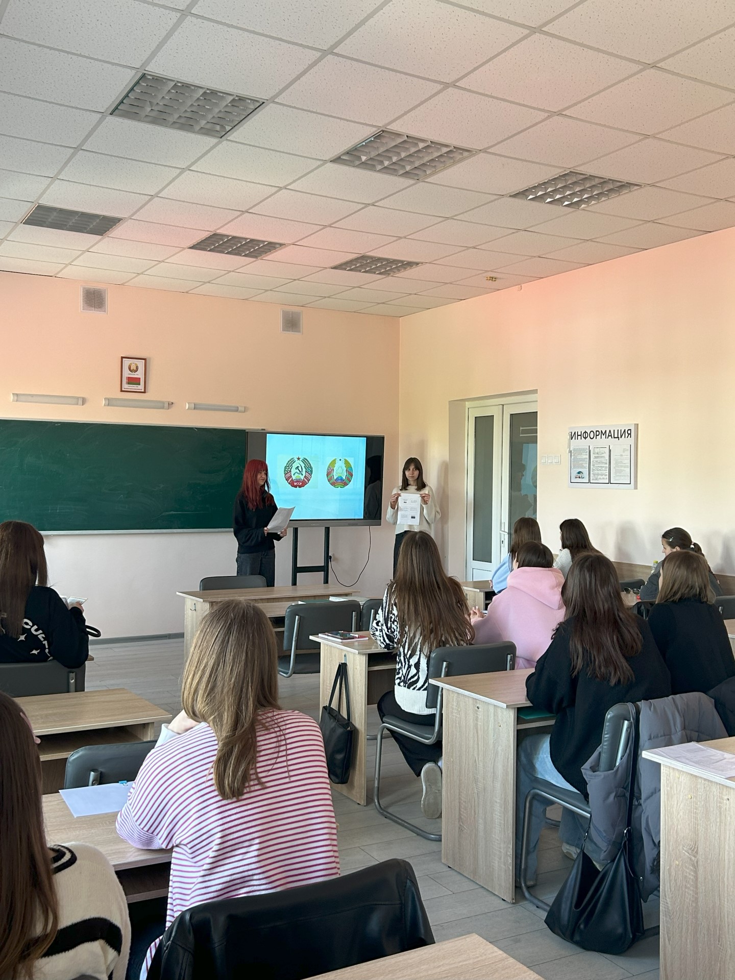 13 мая 2025 года учащиеся группы 2411 совместно с куратором Венгер А.О. провели открытый кураторский час на тему: «День Государственного Флага, Государственного Герба и Государственного Гимна Республики Беларусь - Символы Единства и Гордости».