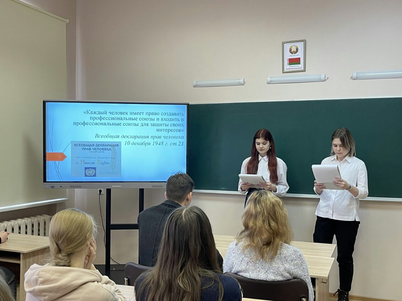 30 ноября 2022 года состоялся открытый кураторский час на тему: «Профсоюз – мой друг!», подготовленный учебной группой 2203 специальности «Финансы», куратор Швабович Е.В., председатель первичной профсоюзной организации преподавателей филиала БГЭУ «Минский финансово-экономический колледж» Белорусского профсоюза банковских и финансовых работников.