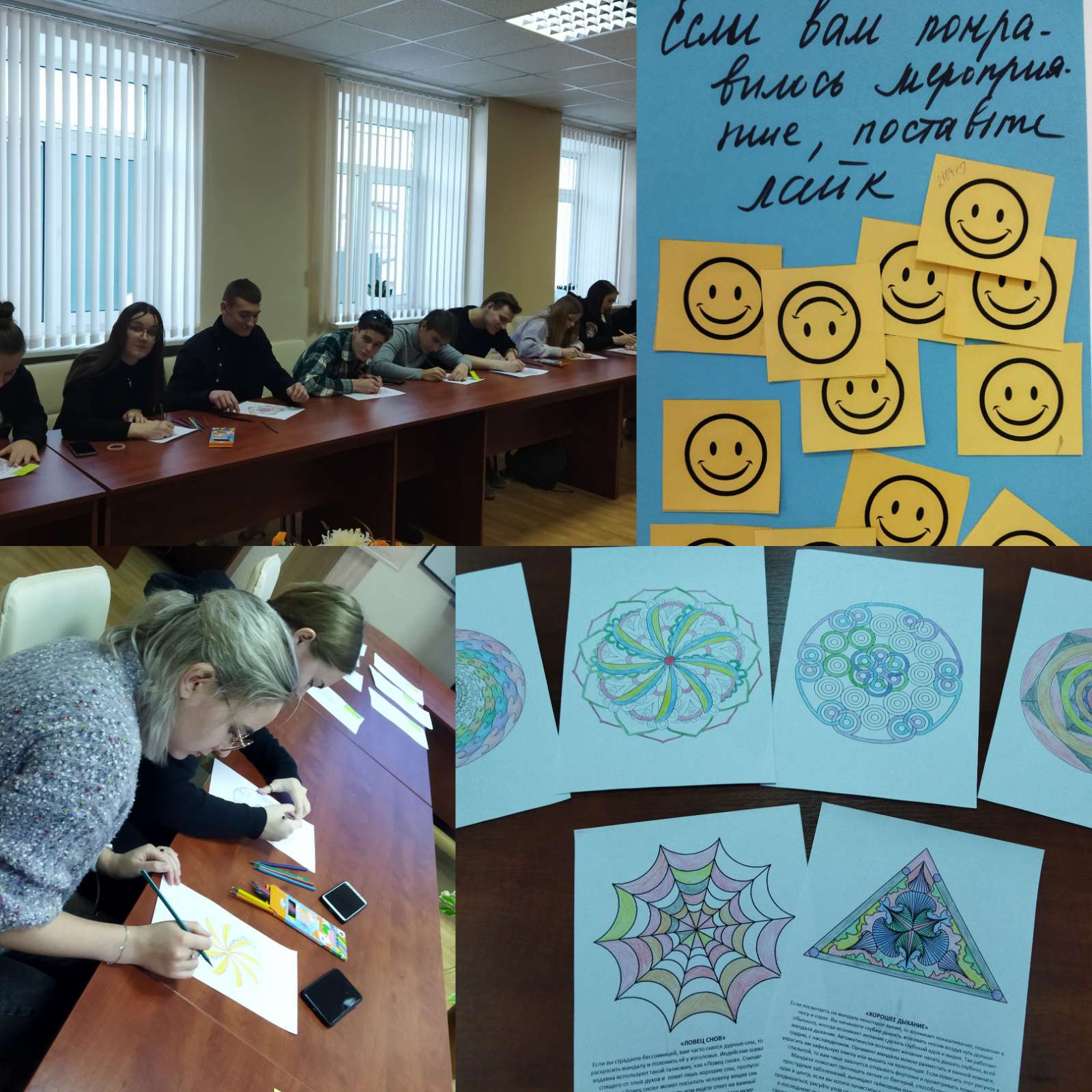 В ходе занятия участники познакомились со способами снижения напряжения в стрессовых ситуациях, возможностями преодоления негативных последствий, техниками медитации, глубокого дыхания, создания мандал.