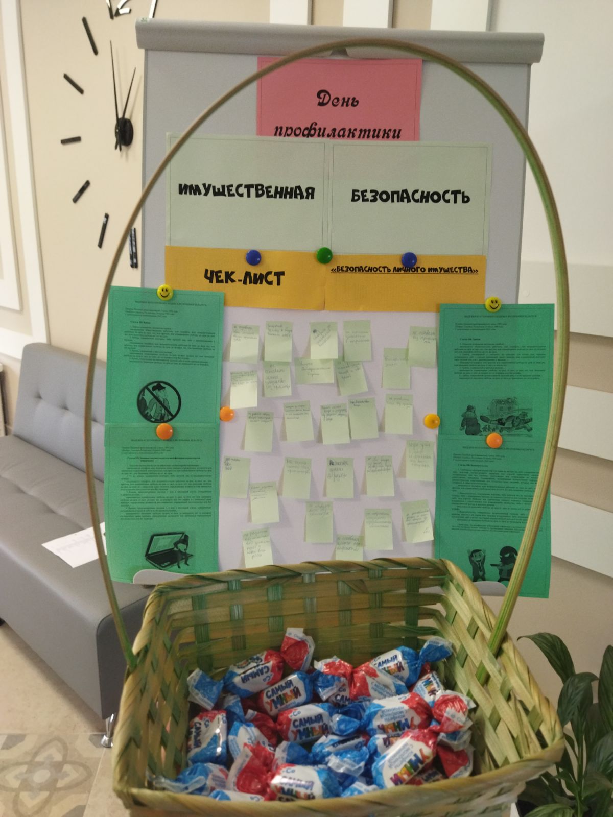 05 апреля 2023 года в филиале БГЭУ «Минский финансово-экономический колледж» проведен День профилактики «Имущественная безопасность»: оформлен информационный стенд, видеоматериалы размещены в телеграмм-канале «МФЭК: помощь рядом», оформлен интерактивный чек-лист «Правила безопасности личного имущества», проведены беседы о необходимости соблюдения этих правил.