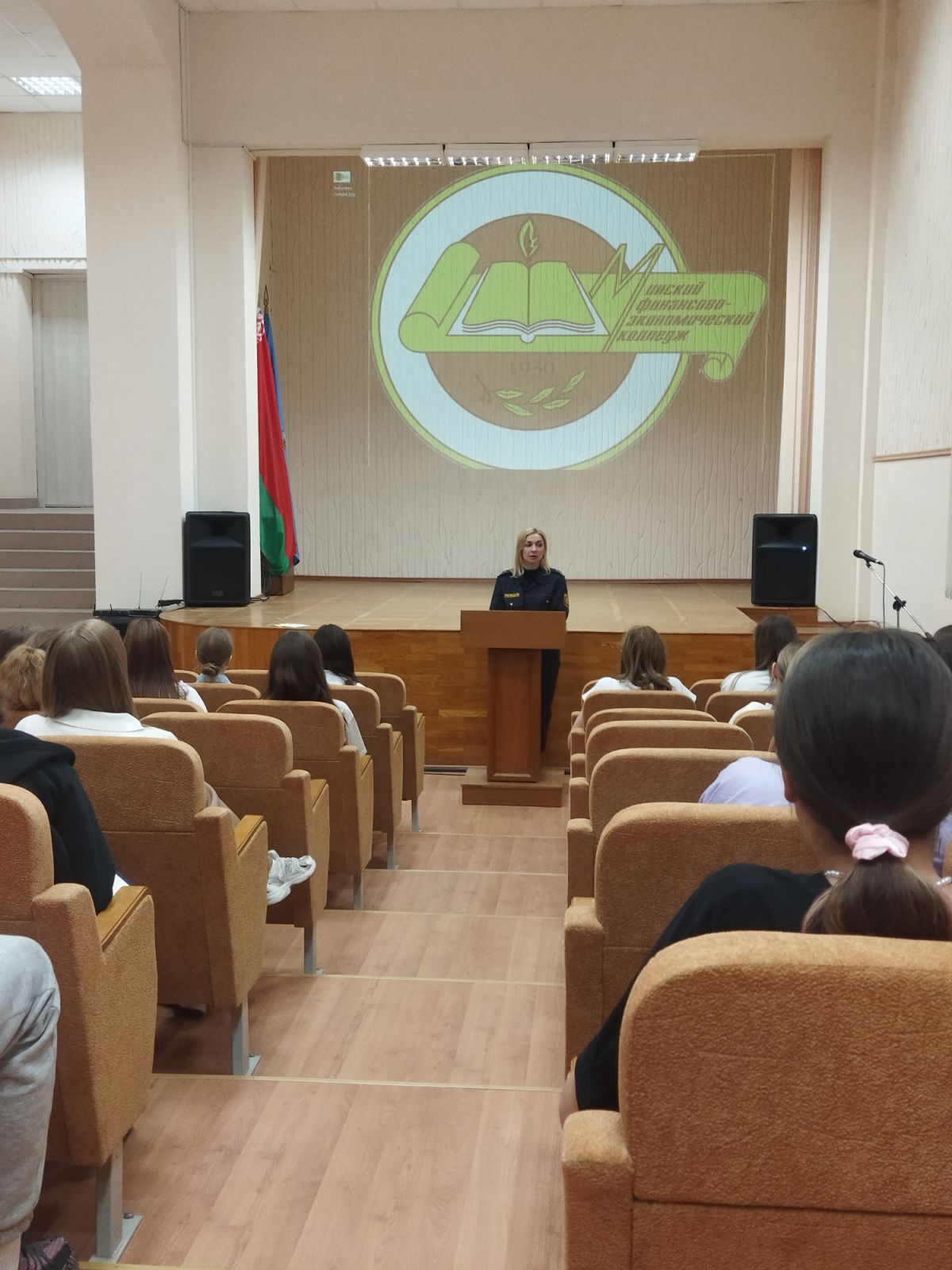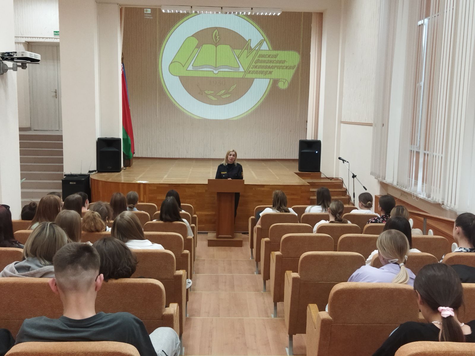 24 мая 2023 года в филиале БГЭУ «Минский финансово-экономический колледж» перед учащимися 1 курса выступила инспектор по делам несовершеннолетних управления внутренних дел Советского района Круталевич Татьяна Владимировна по теме: «Безопасное и ответственное поведение в период летних каникул».