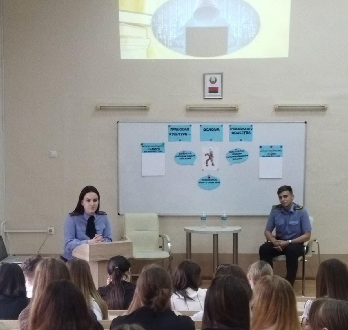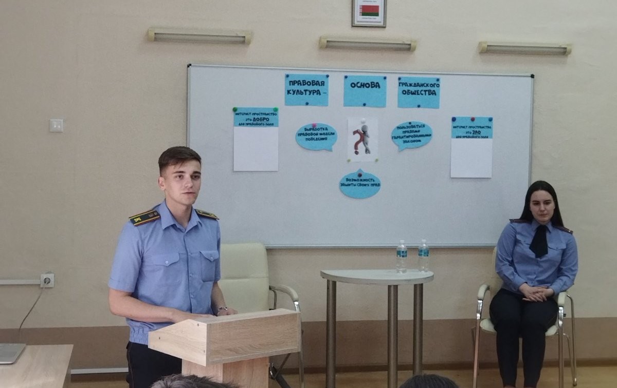 30 мая 2024 года в рамках реализации плана мероприятий, приуроченных ко Дню защиты детей, в колледже состоялась диалоговая площадка на тему «Права молодежи и гражданская ответственность за будущее страны», на которой в качестве экспертов по правовым вопросам присутствовали инспектор ИДН УВД Советского района Андриевская Алина Вадимовна, курсант выпускного курса факультета криминальной милиции Егор Стальмаков. Встреча состоялась с учащимися 1 курса.