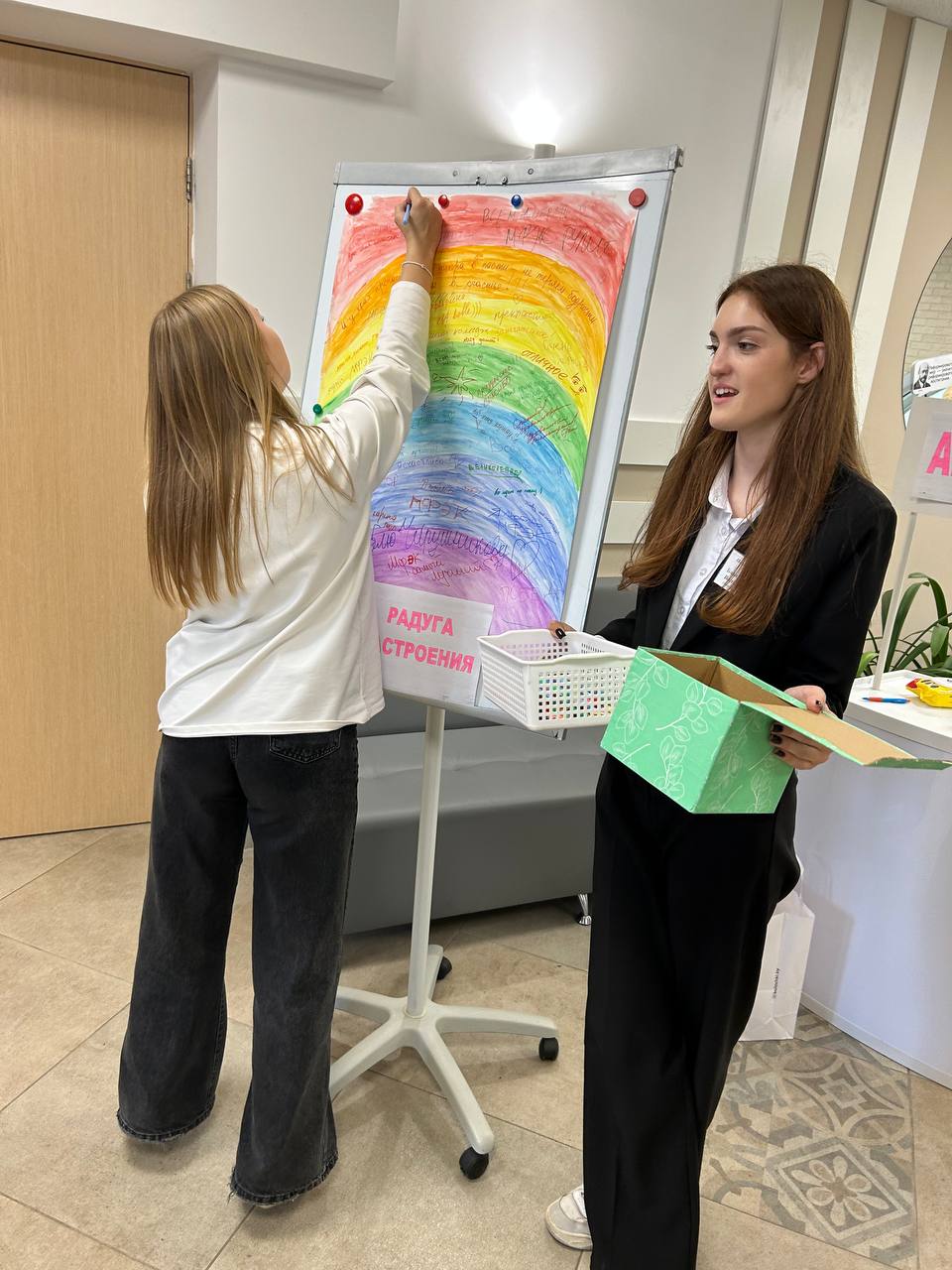Задали тон сегодняшнего дня с помощью мыльных пузырей и мини -мотиваторов. Делились теплыми словами друг с другом и опустошили ларец с оптимистическими предсказаниями на ближайшее будущее. Заполнили «Радугу настояния» учебного дня своим эмоциональным состоянием и закрепили его с помощью аквагрима.