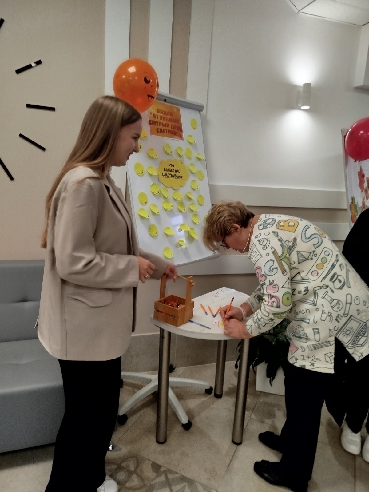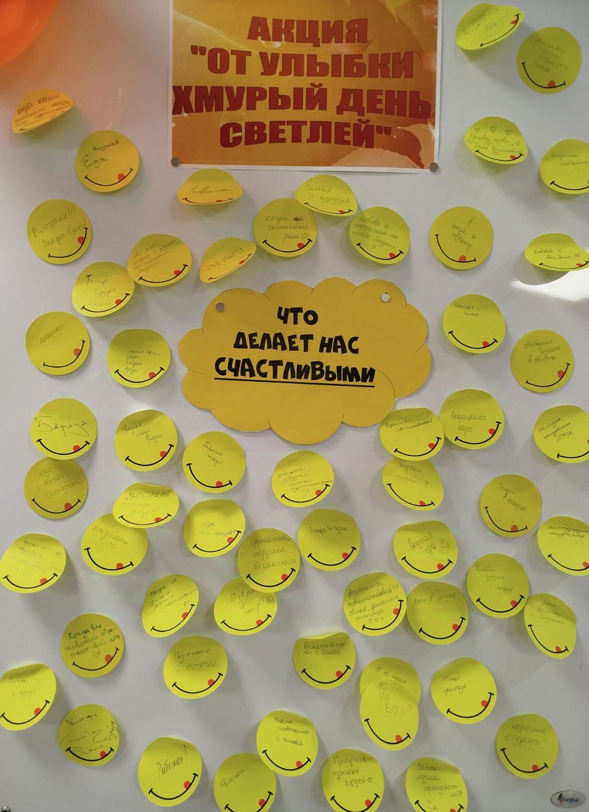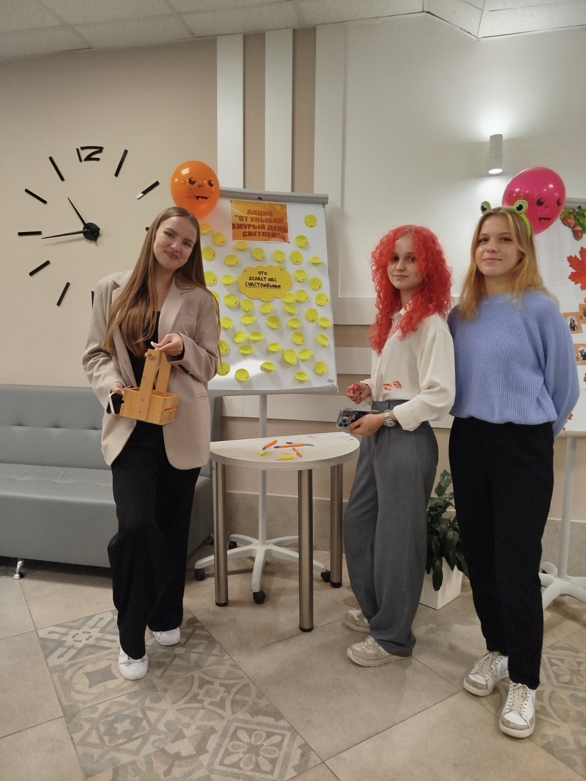 5 октября 2024 года с целью создания благоприятного эмоционального климата в учреждении образования в колледже была организована интерактивная площадка «От улыбки хмурый день светлей!»,  где  каждому участнику необходимо было письменно ответить на вопрос, что делает его счастливым.  Итогом акции стал солнечно-позитивный и яркий стенд с радостями жизни.