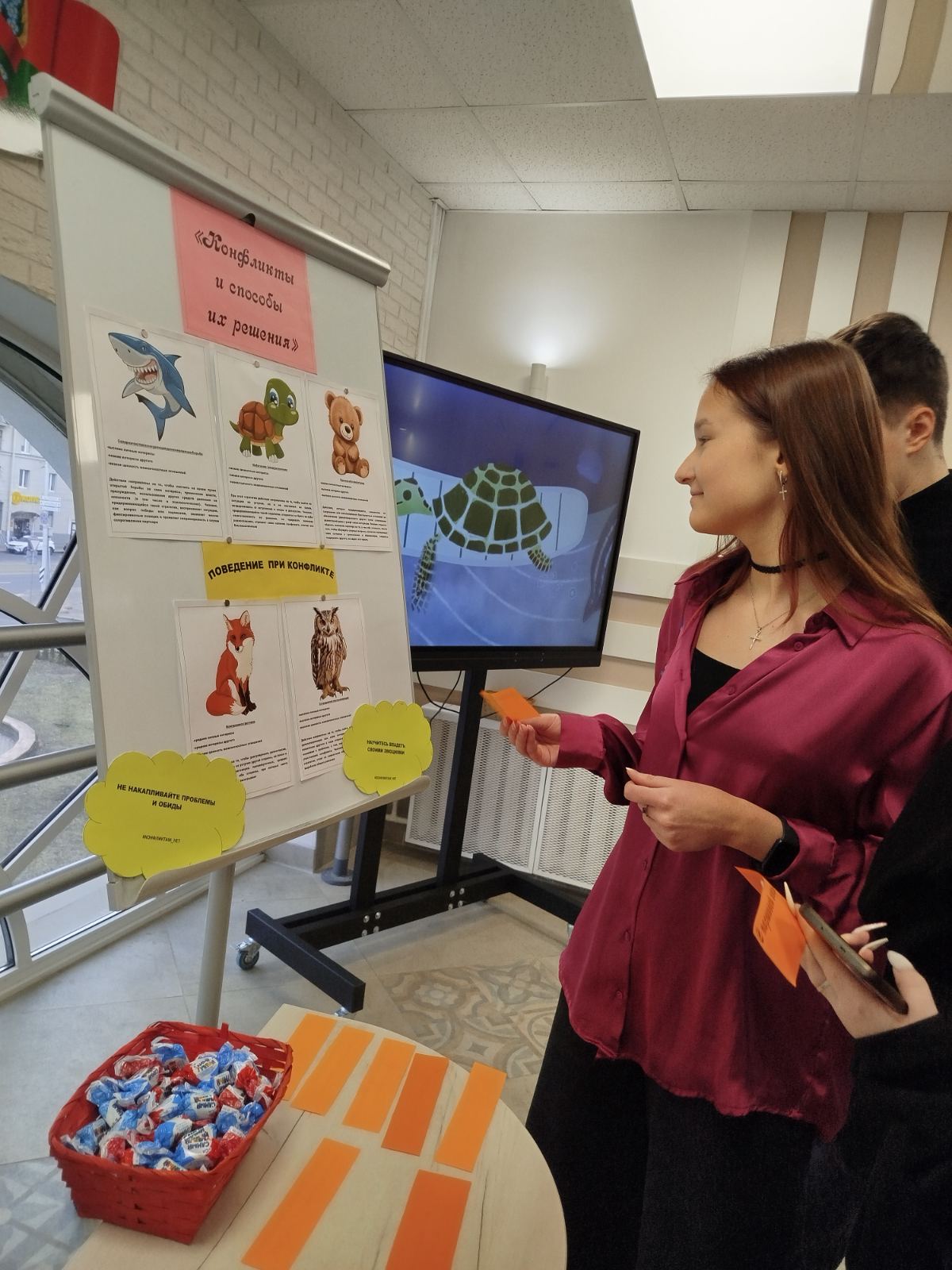20 января 2025  года в колледже проведен ряд мероприятий в рамках Дня профилактики «Конфликты и способы их решения»: в течения дня транслировались мультфильмы на тему разрешения конфликтов, оформлен информационный стенд, подготовлены брошюры, в телеграм-канале «МФЭК: помощь рядом» размещены видеоматериалы «Как избежать конфликтов», «5 способов решения конфликта», проведена интерактивная площадка «#КОНФЛІКТАМ_НЕТ».