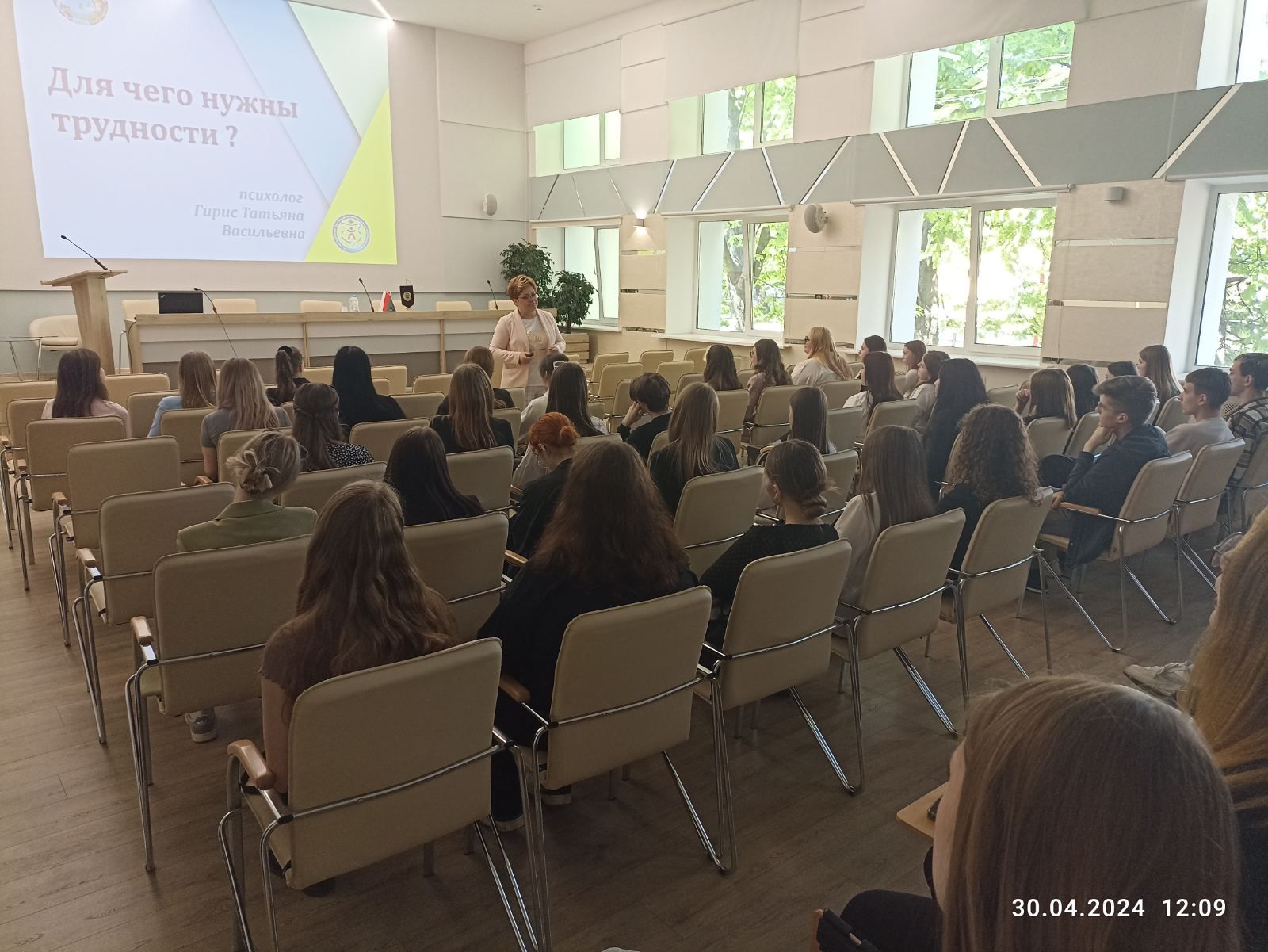 2 мая 2024 года для учащихся II курса психолог ЦДП «Ювентус» Гирис Т.В. выступила по теме «Для чего нужны трудности?» в рамках мероприятий по профилактике стресса и ативитальных переживаний у учащихся.