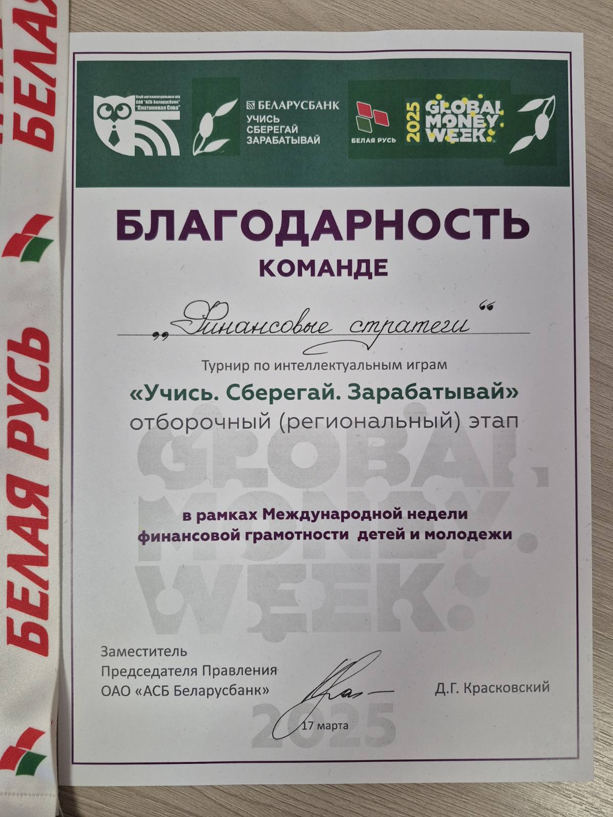 17 марта 2025 г. учащиеся колледжа приняли участие в турнире по интеллектуальным играм «Учись. Сберегай. Зарабатывай». Команда колледжа «Финансовые стратеги» успешно справилась с большей частью вопросов, получила благодарность от организаторов.