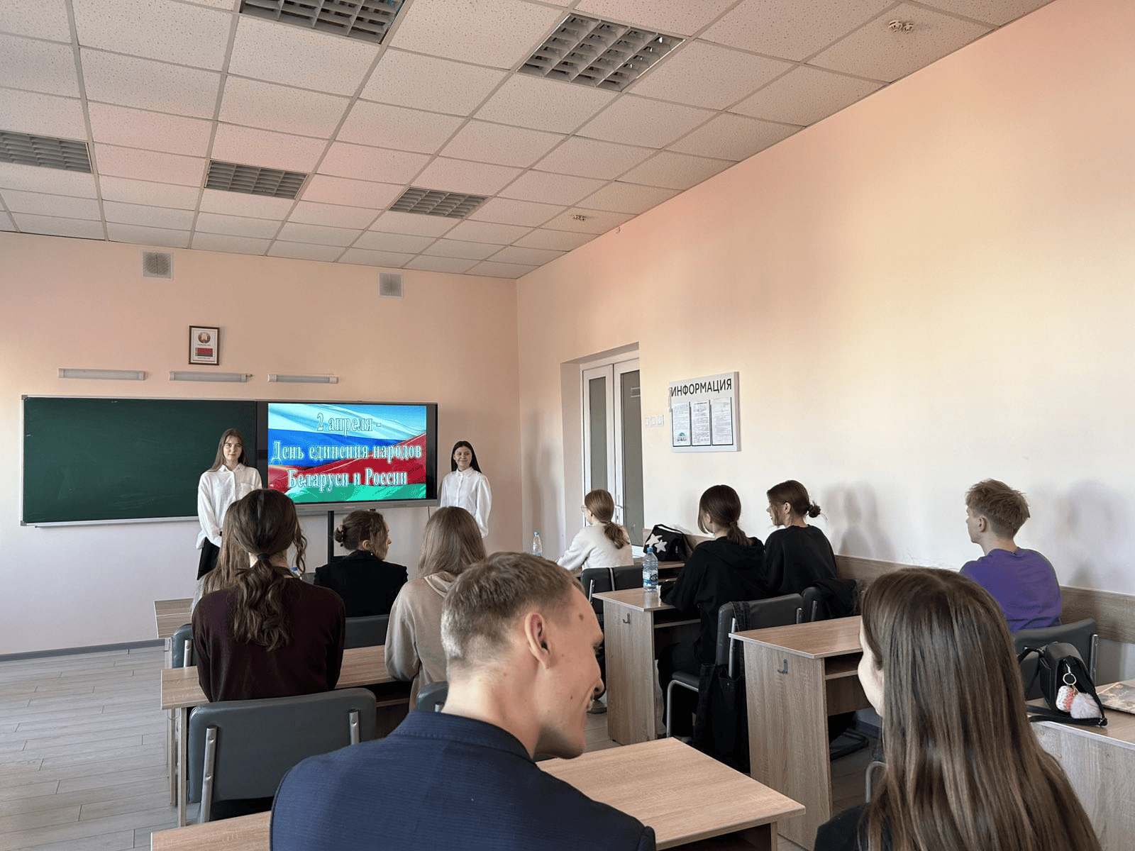 С 1 по 3 апреля 2025 года во всех учебных группах проведен Единый урок на тему «День единения народов Беларуси и России».  Этот день символизирует глубокие исторические, культурные и экономические связи между двумя странами, которые на протяжении веков развивались бок о бок, преодолевая трудности и разделяя радости. Праздник напоминает о единстве, взаимопомощи и общих ценностях, которые объединяют белорусов и россиян.