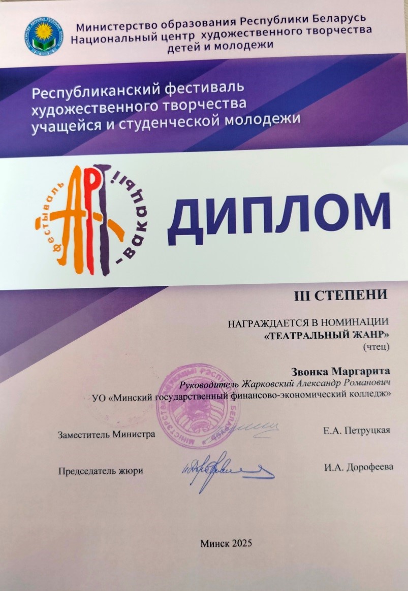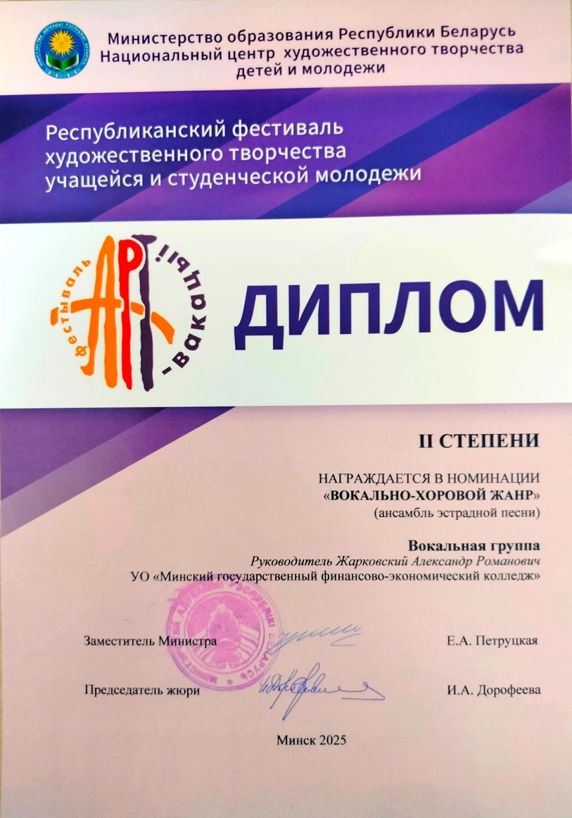 По итогам республиканского фестиваля художественного творчества учащейся и студенческой молодежи «АРТ-вакацыі–2025» дипломами Министерства образования Республики Беларусь награждены учащиеся колледжа: