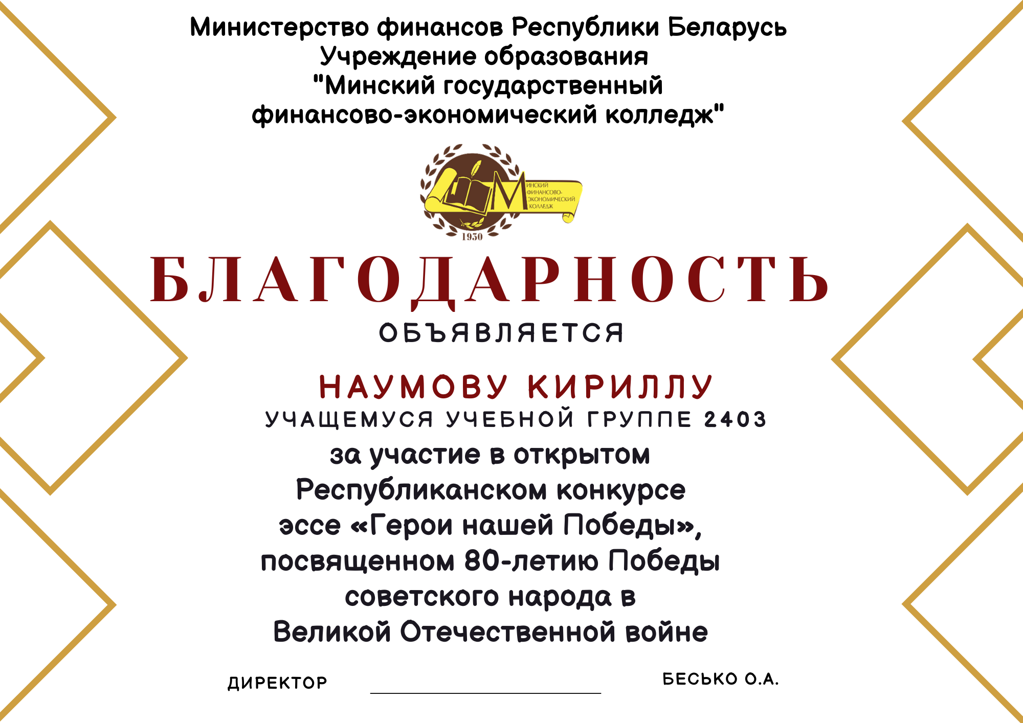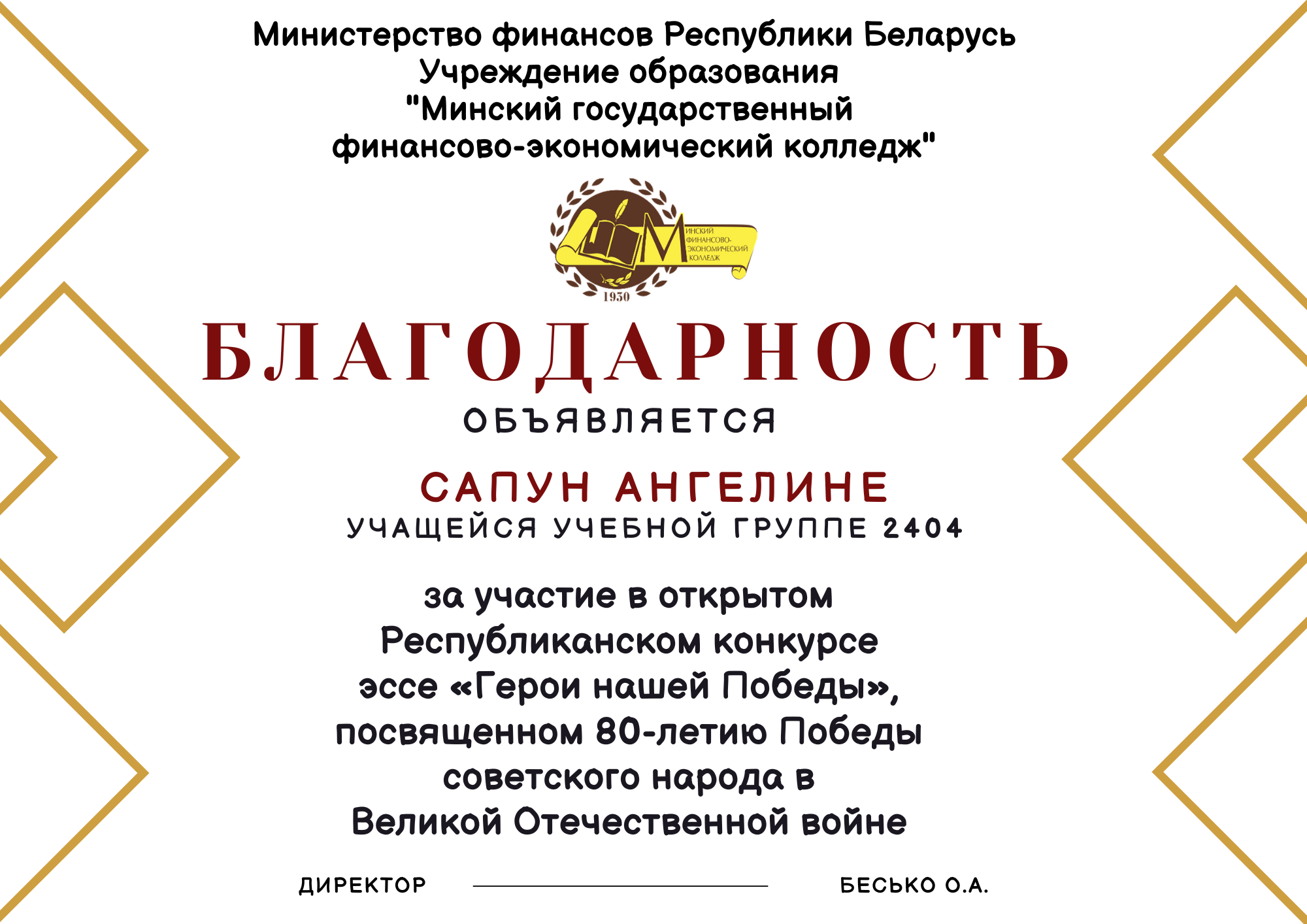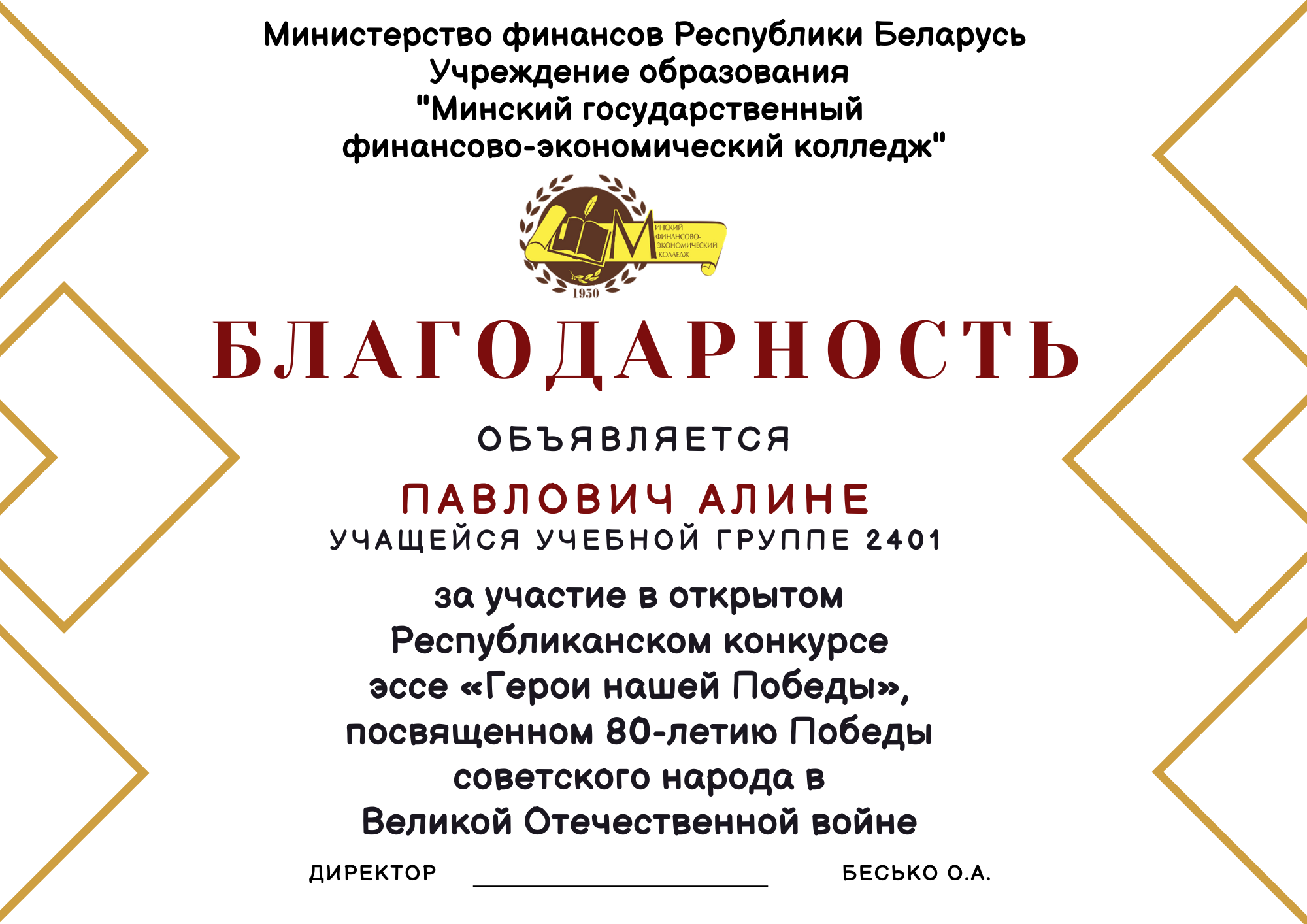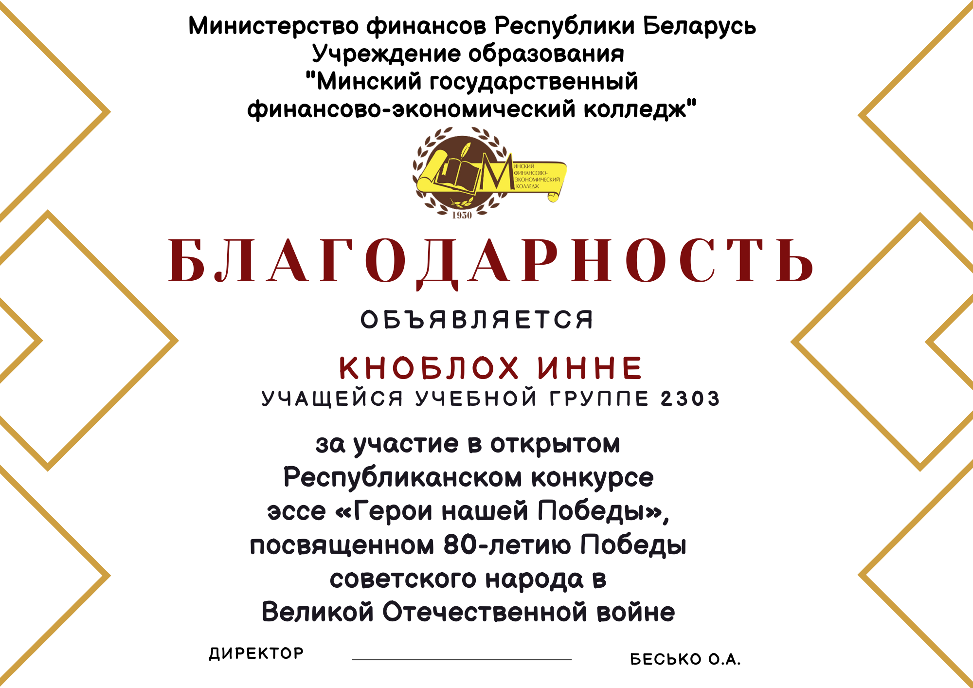 За активное участие в конкурсе учащейся учебной группы 2401 Павлович Алине, учебной группы 2304 Сапун Ангелине, учебной группы 2303 Кноблох Инне и учащемуся учебной группы 2403 Наумову Кириллу была объявлена благодарность директора колледжа Бесько О.А.