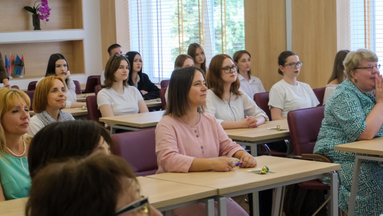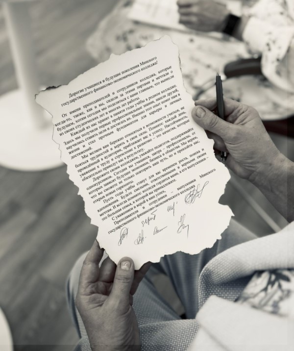 На встрече присутствовали выпускники, работающие в бухгалтерии колледжа: Богданович Юлия Георгиевна, Циуля Екатерина Ивановна, Шеховцова Кристина Викторовна, Зудина Анастасия Валерьевна, и преподаватели: Войнич Татьяна Анатольевна, Стасевич Снежана Сергеевна, Матук Клавдия Николаевна.