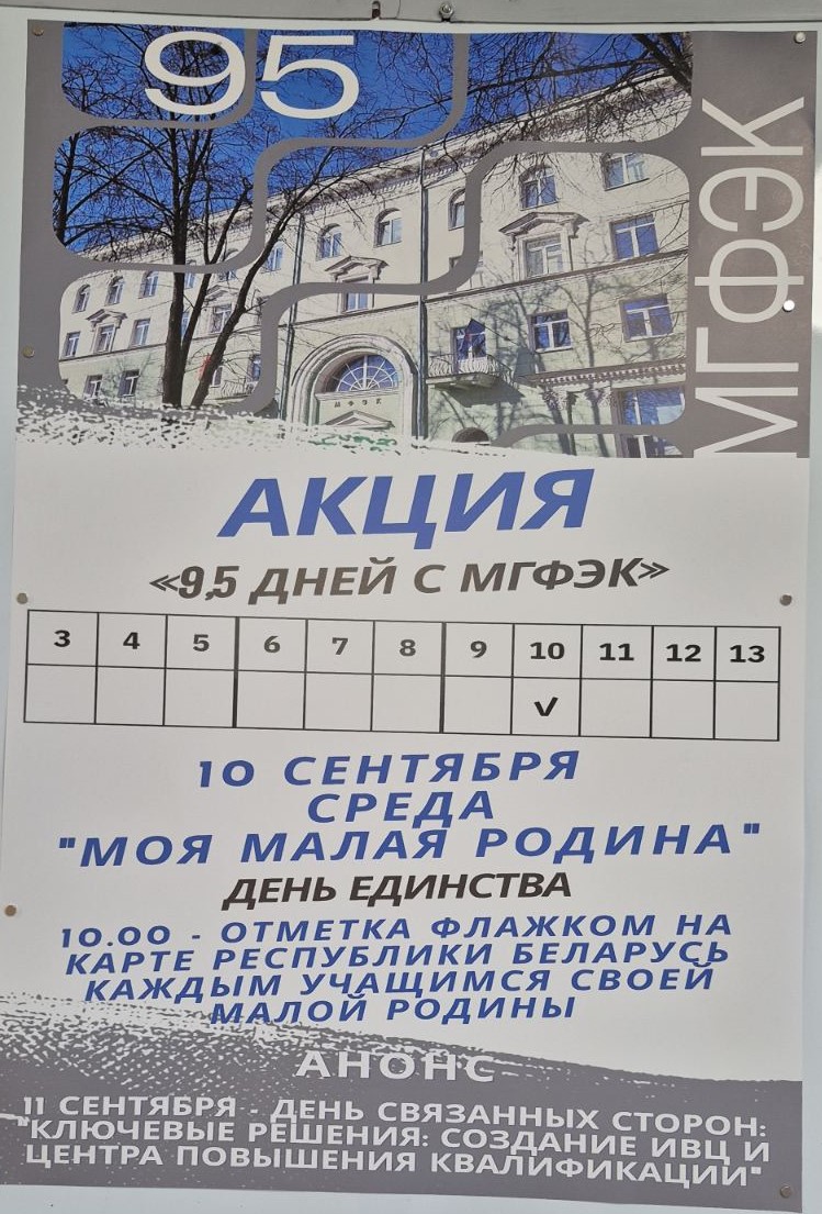 10 сентября 2025 года в рамках акции «9,5 дней с МГФЭК» в колледже прошел один из самых душевных и наглядных флешмобов – «Моя малая Родина». Его итогом стала большая карта Республики Беларусь, которая буквально «расцвела» десятками флажков, символизирующих малую родину учащихся и работников колледжа.