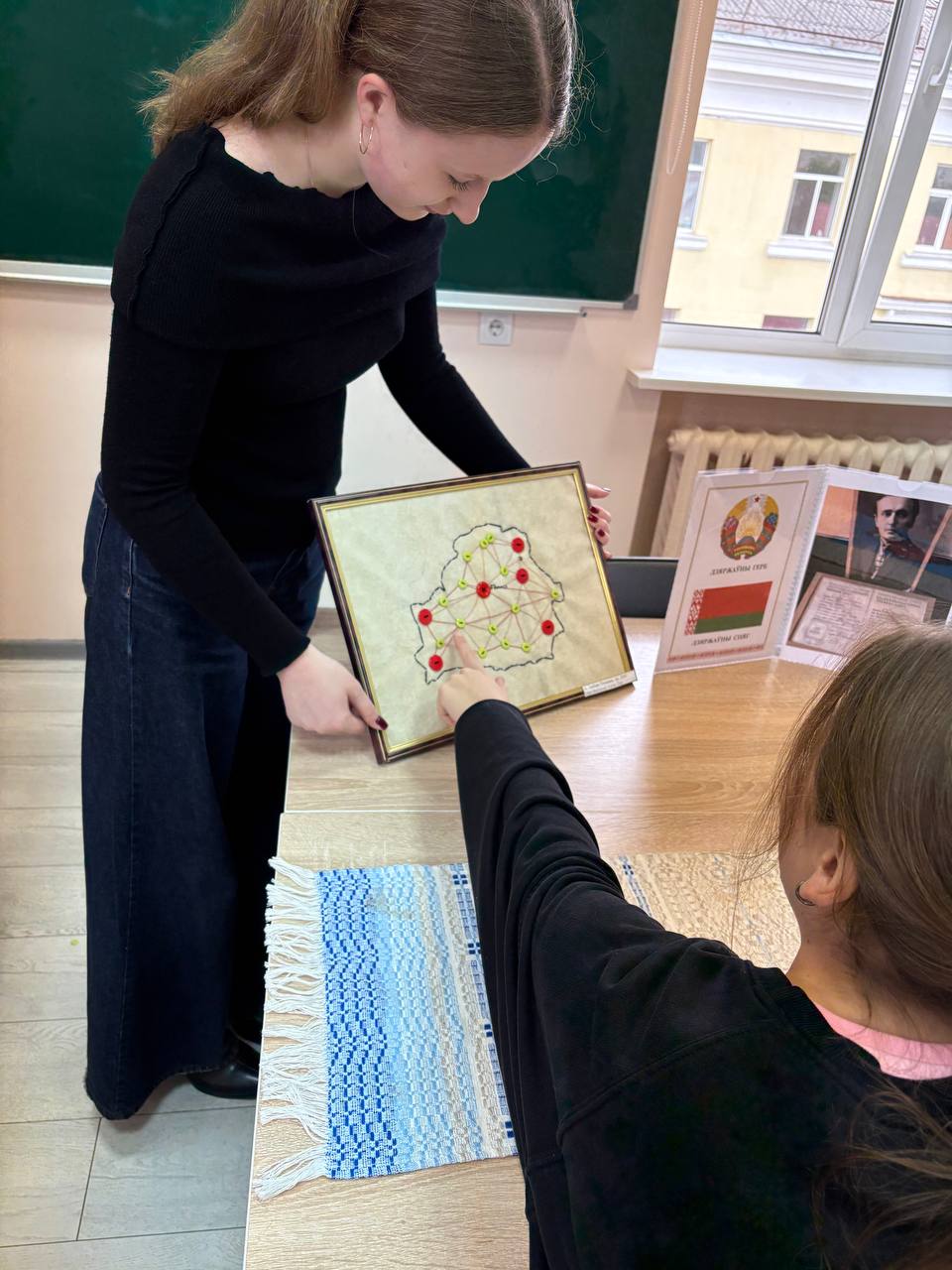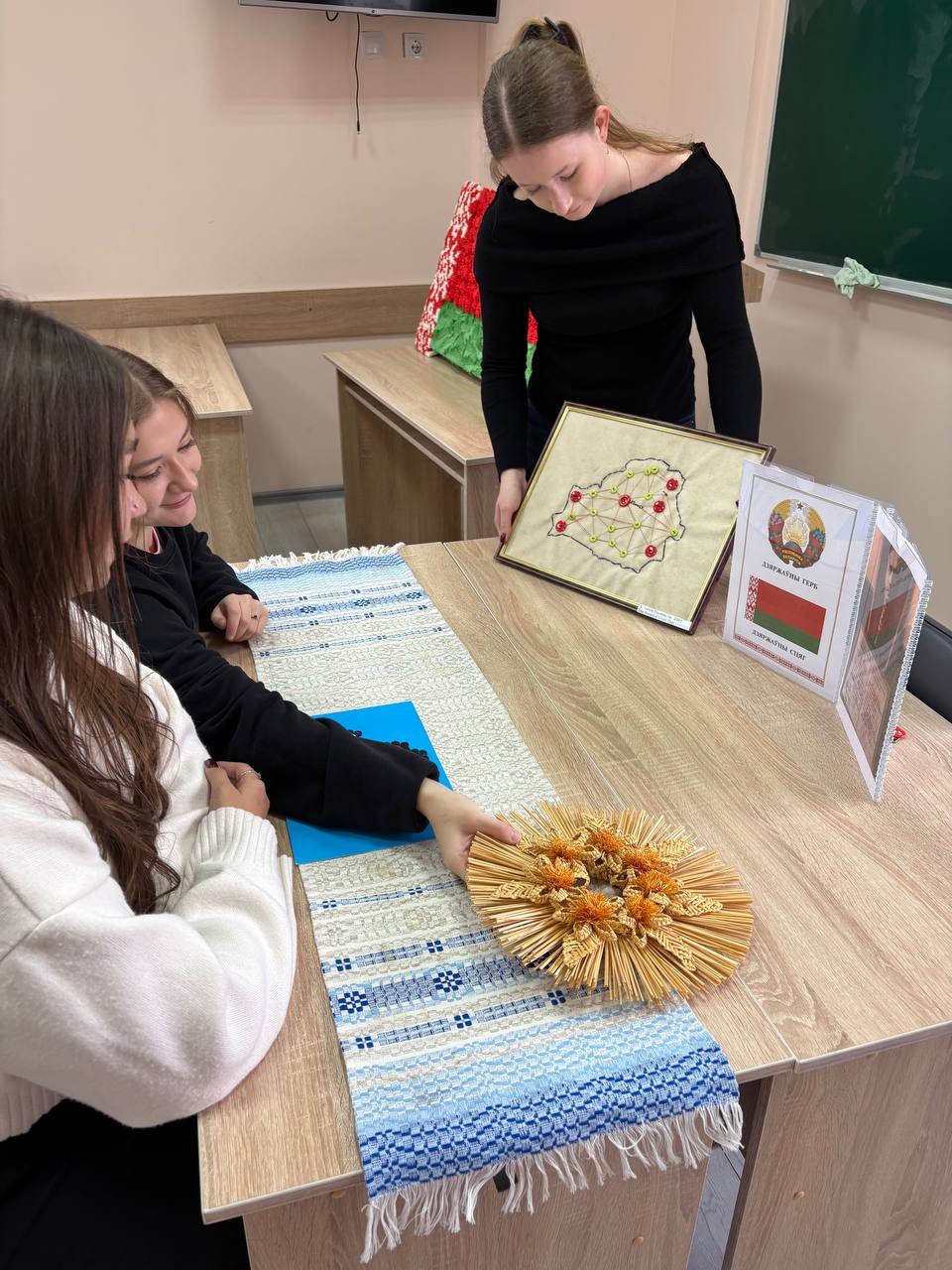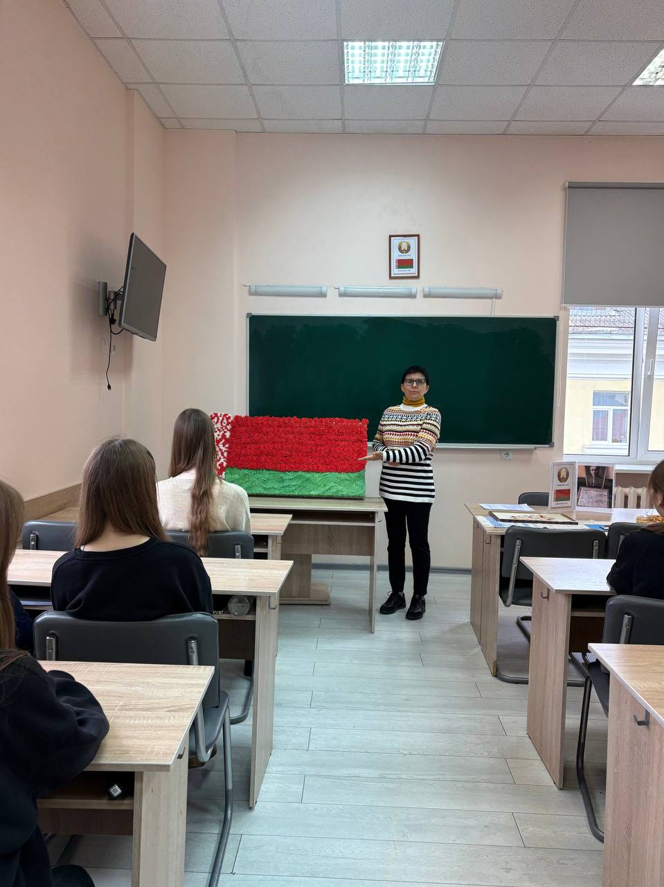 Учащиеся познакомились с жизнью и творчеством авторов Государственного гимна нашей страны, ответили на вопросы викторины по истории создания Герба и Государственного флага Республики Беларусь. Куратор учебной группы Расторгуева Л.В. рассказала об участии творческой группы учащихся колледжа в открытом конкурсе творческих работ «Символы моей страны», организованном РОО «Белая Русь» и Музеем современной белорусской государственности Национального исторического музея Республики Беларусь в 2020 году. Проект учащихся колледжа завоевал первое место первое место в номинации «Лучший флаг» с работой из бумаги «Квiтней, родны сцяг!». Также учащиеся познакомились с творческими работами учащихся колледжа для выставки "My beautiful motherland", подготовленной цикловой комиссией филологических предметов