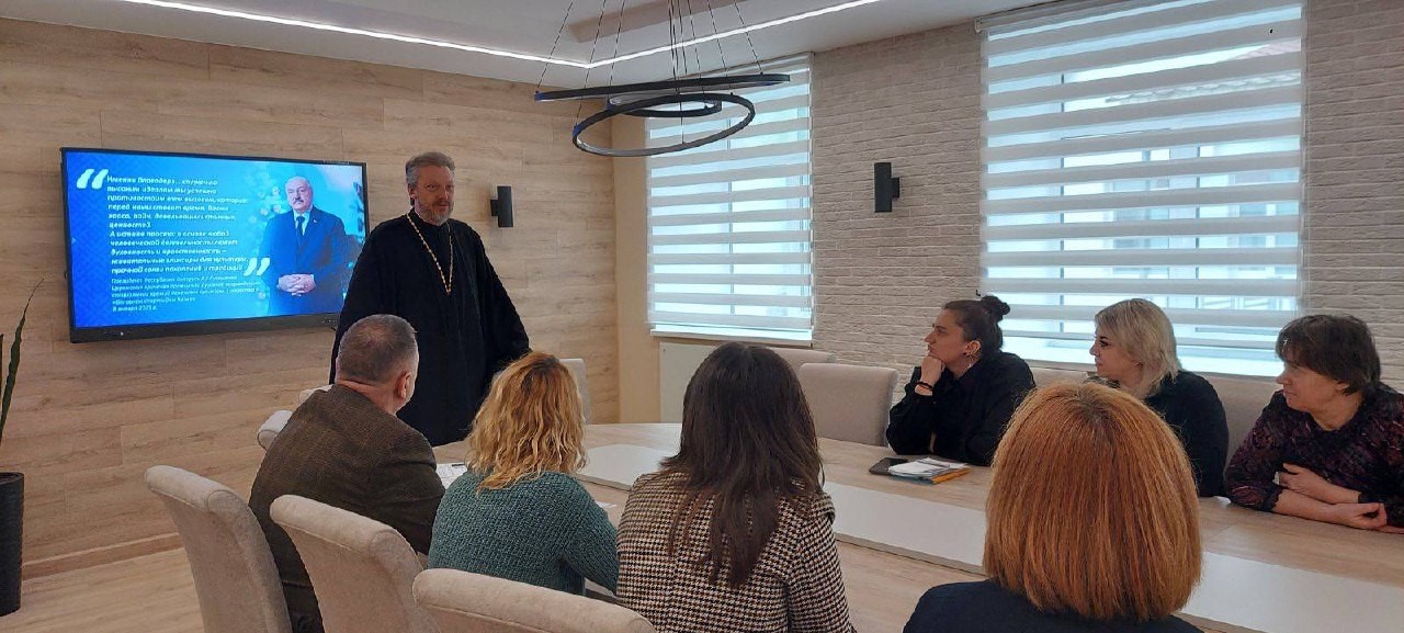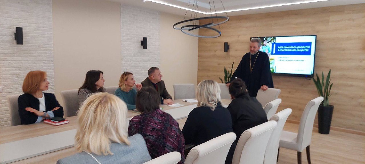 Перед сотрудниками колледжа выступил Иерей Алексей Владимирович Соколов, который рассказал о важности семьи для современного общества, ее роли в воспитании детей и заботе о старшем поколении. Он подчеркнул, что семья является фундаментом для формирования нравственных ценностей, где человек познает основные законы жизни.