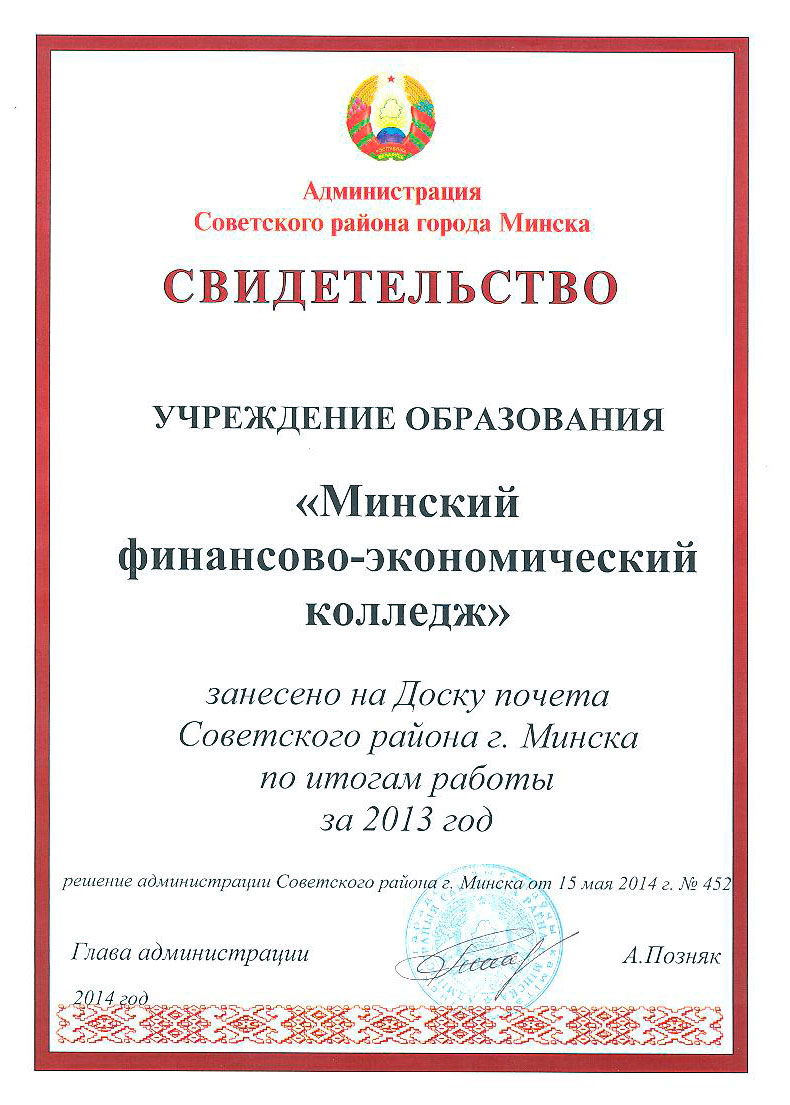 2014 год – Свидетельство занесения ГУО «МФЭК» на Доску Почёта Советского района г. Минска по итогам работы за 2013 год.
