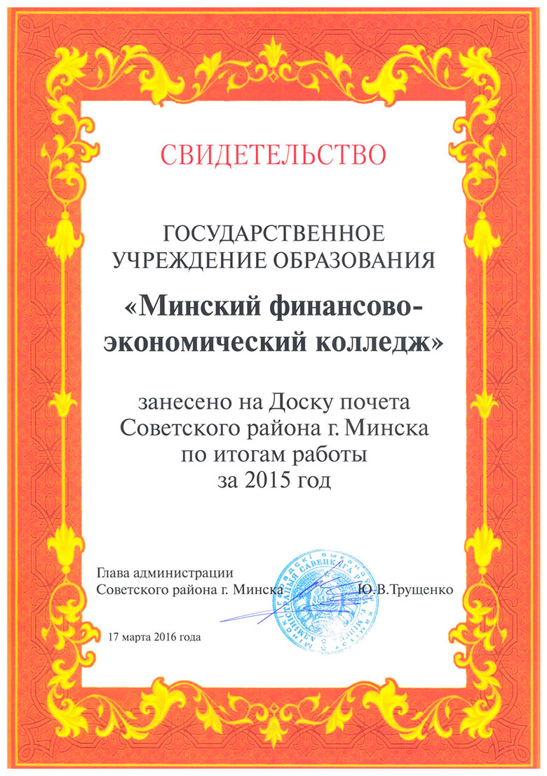 2016 год – Свидетельство занесения ГУО «МФЭК» на Доску Почёта Советского района г. Минска по итогам работы за 2015 год.