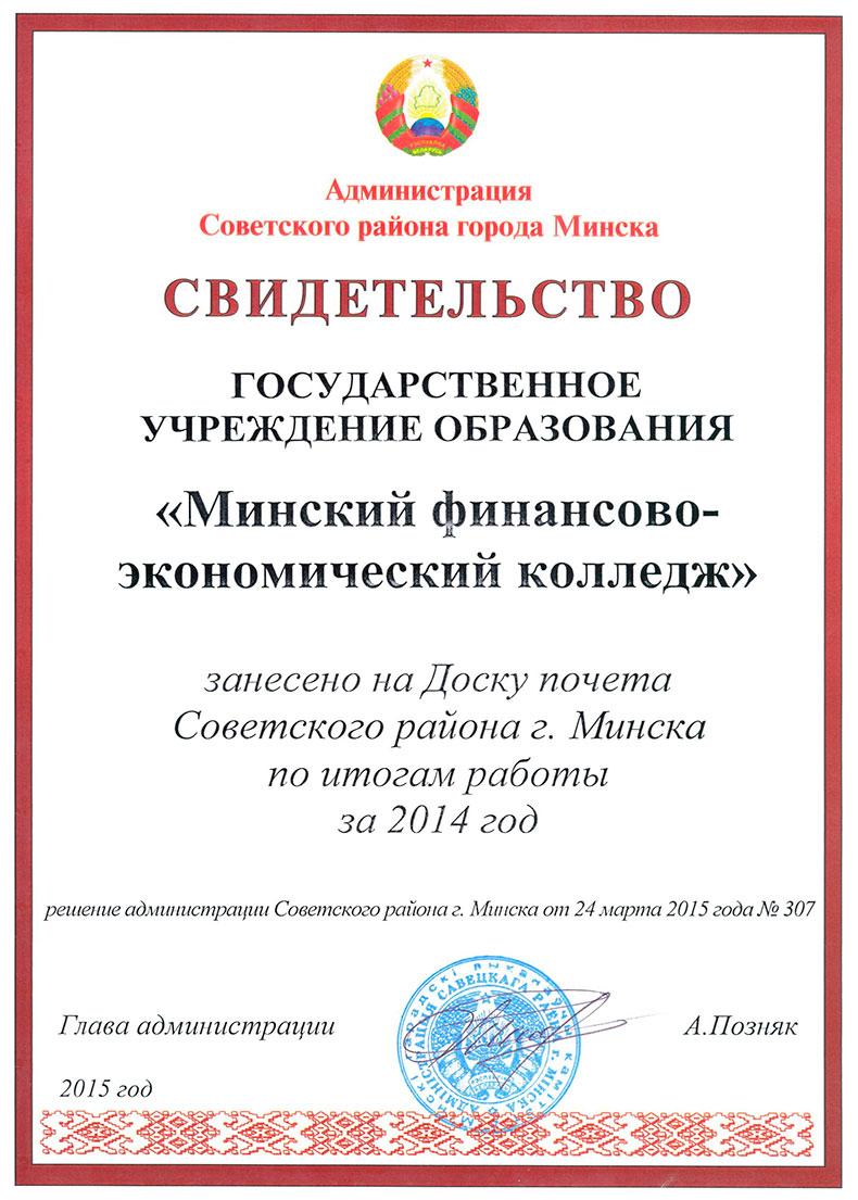 2015 год – Свидетельство занесения ГУО «МФЭК» на Доску Почёта Советского района г. Минска по итогам работы за 2014 год.