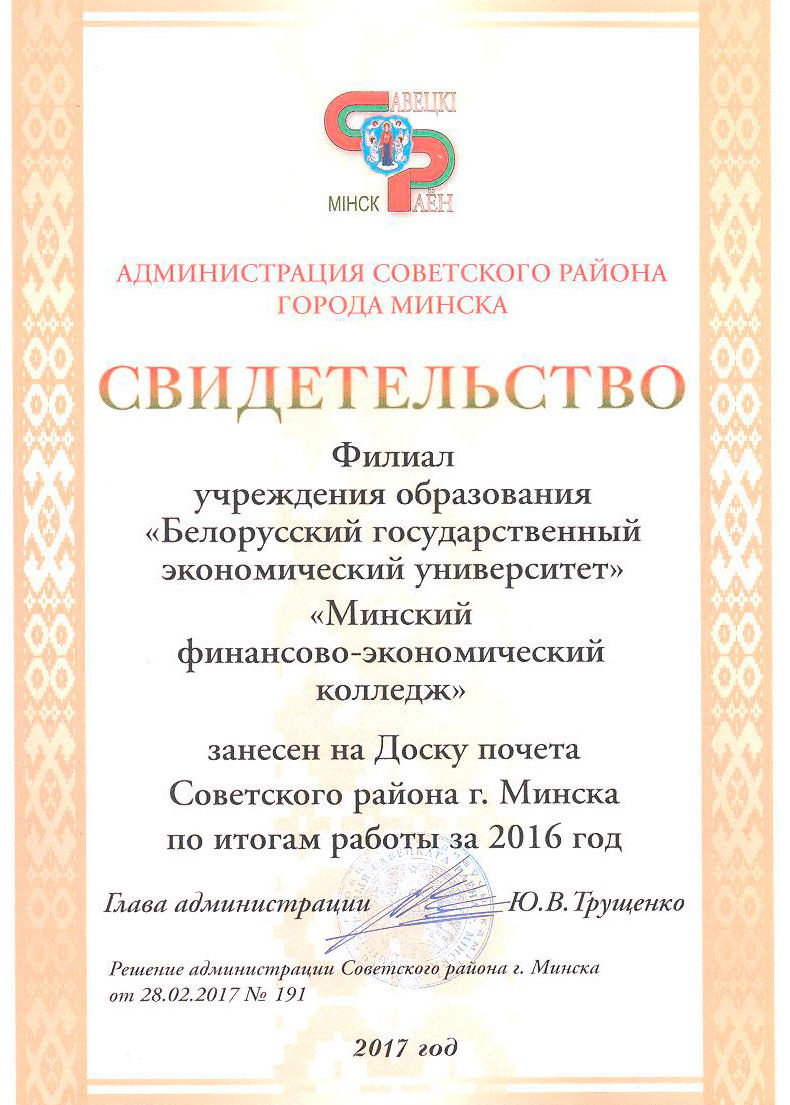 2017 год – Свидетельство занесения ГУО «МФЭК» на Доску Почёта Советского района г. Минска по итогам работы за 2016 год.