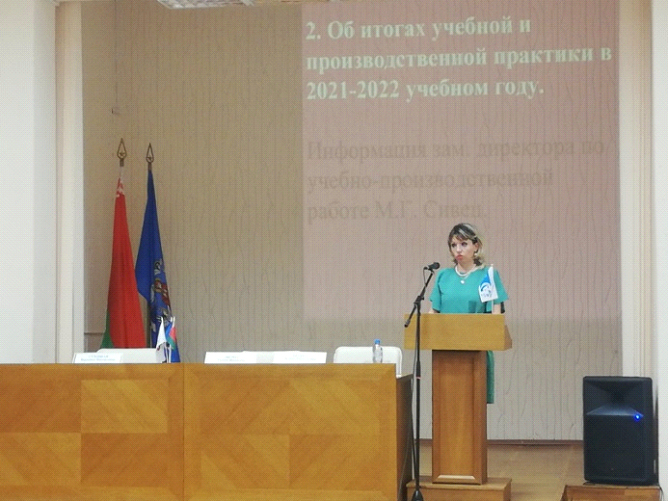Заместитель директора по учебно-производственной работе Сивец Мария Григорьевна выступила по вопросу «Об итогах учебной и производственной практики в 2021-2022 учебном году».