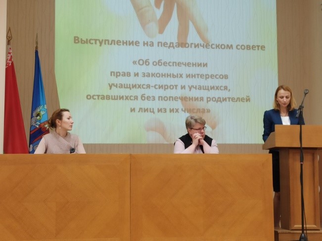 Педагог социальный Емельянова Татьяна Николаевна информировала присутствующих об обеспечении защиты прав и интересов учащихся-сирот и учащихся, оставшихся без попечения родителей.