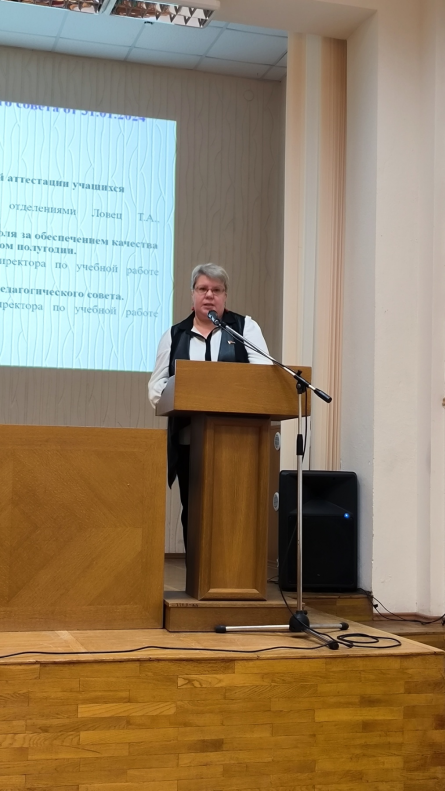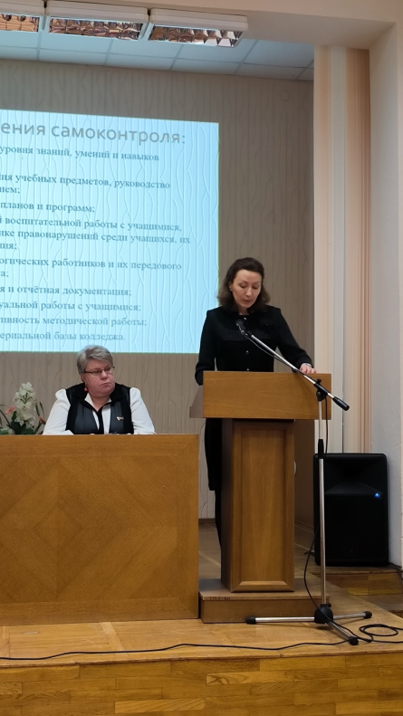 Заместитель директора по учебной работе Сухоцкая Вероника Михайловна доложила о результатах самоконтроля за обеспечением качества образования в колледже в первом полугодии и о выполнении решений педагогического совета.