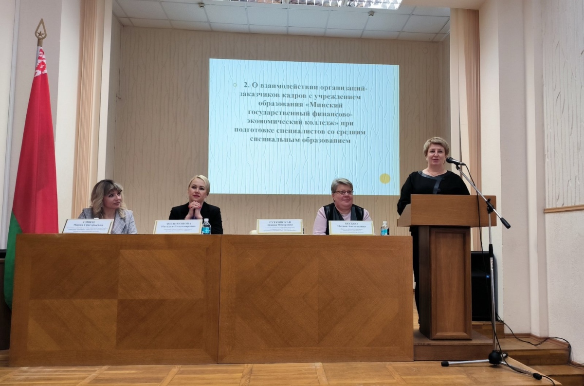С информацией выступили заместитель директора по учебно-производственной работе М.Г.Сивец, заведующая отделением О.Н.Пархимчик, педагог социальный Т.Н.Емельянова и представители заказчиков кадров - начальник отдела по работе с персоналом филиала Белгосстраха по г. Минску Н.В. Филимонова, главный специалист управления рекрутинга и сопровождения HR- процессов департамента персонала ОАО «АСБ Беларусбанк» Ж.Ф.Гутковская.