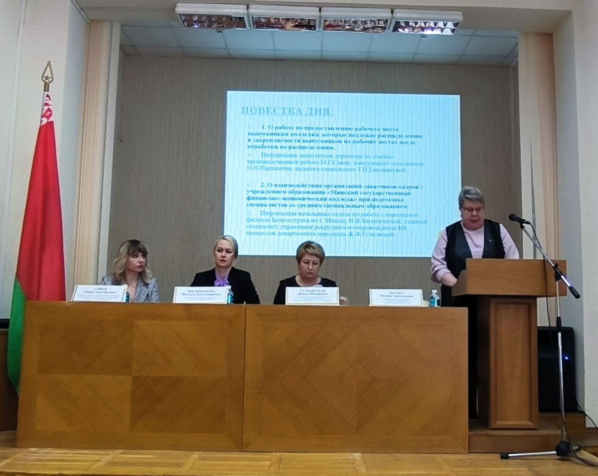 21 марта 2024 года в колледже прошло заседание педагогического совета, но котором рассмотрены вопросы о работе по предоставлению первого рабочего места выпускникам колледжа, которые подлежат распределению и закрепляемости выпускников на рабочих местах после отработки по распределению и о взаимодействии организаций-заказчиков кадров с учреждением образования «Минский государственный финансово-экономический колледж» при подготовке специалистов со средним специальным образованием.