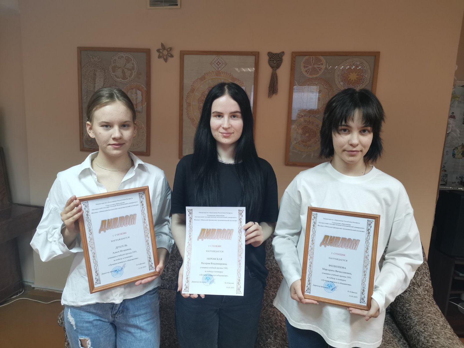 По результатам проверок бытового сектора совета общежития «Лучшей комнатой» определена комната № 1013. Её жильцы Неронская Валерия, Драгель Алеся и Филиппова Маргарита были награждены памятными сувенирами.